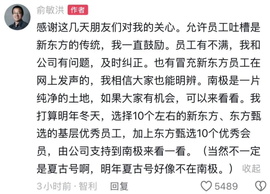 随即,他正面回应了该问题,称明年会选10个左右的优秀员工也到南极旅游,并表示鼓励员工吐槽。