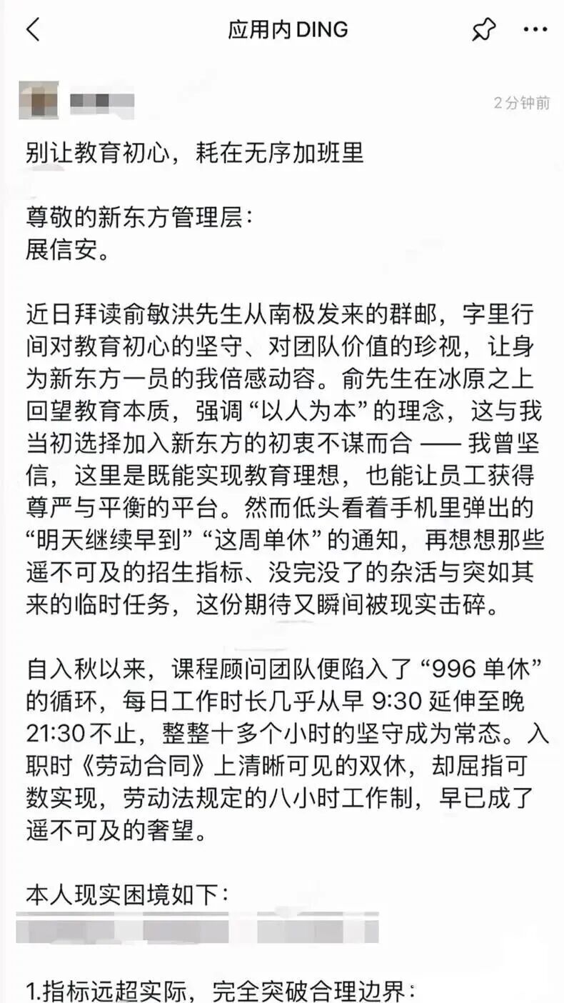 但前几天一名员工在新东方内网控诉自己深陷每天工作超12小时、指标高压及双休难保困境的信,却很快被删除,发布者账号也遭封禁。