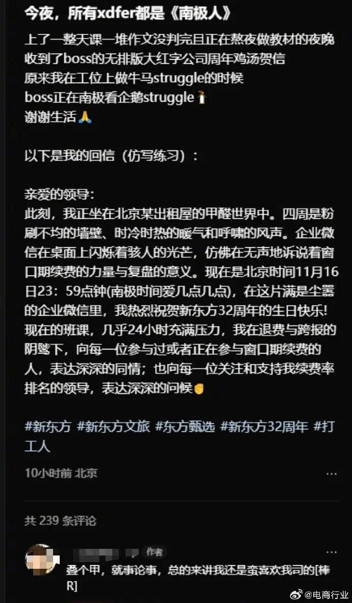 此前,俞敏洪因“南极小作文”的鸡汤言论遭到员工吐槽,但是其小作文中六次慷慨激昂提到南极,与员工辛劳工作之间的反差仍然在网上引发大量讨论,甚至被网友指“爹味”“自嗨”“无法共情”。