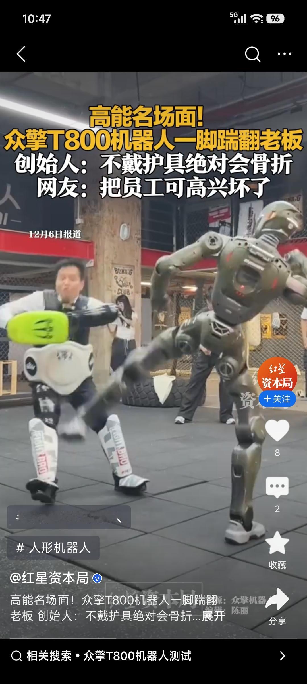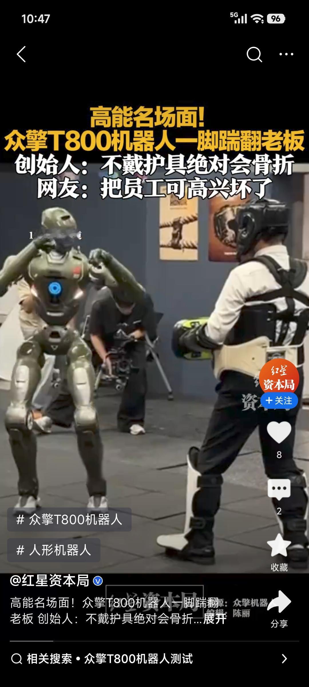 最近众擎T800人形机器人一脚踹倒CEO的视频火了。这是品牌给T800做性能测试,CEO赵同阳亲自上阵,还穿了护具。第一次测试他反应快躲开了飞踢,第二次没避开,被一脚踹在肚子上直接倒地。 这T800身高173cm,体重75公斤,有29个可活动关节,关节最大力气能到450N·m。它不光能飞踢,组合拳、回旋踢等复杂动作也不在话下,感知还很灵敏。视频传开后网友炸开锅,有人调侃机器人“胆子大”,也有人说老板“拿命试性能”。不过这也让人担心,这么猛的机器人,后续使用安全咋保障呢?