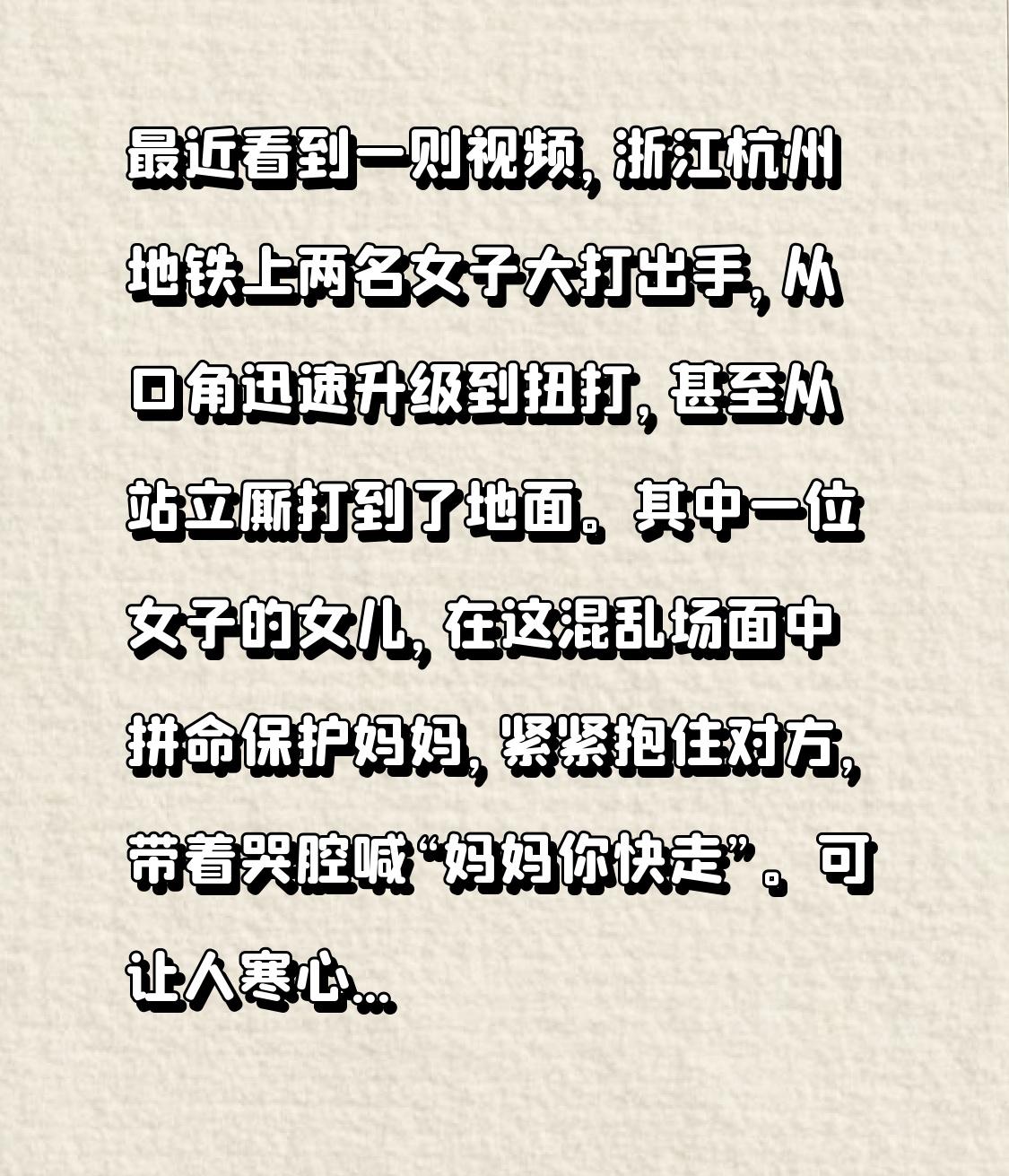 最近看到一则视频,浙江杭州地铁上两名女子大打出手,从口角迅速升级到扭打,甚至从站立厮打到了地面。其中一位女子的女儿,在这混乱场面中拼命保护妈妈,紧紧抱住对方,带着哭腔喊“妈妈你快走”。 可让人寒心的是,车厢里那么多乘客,却都在冷漠围观,有人举着手机录像,有人探着头看,有人默默躲开。这视频在网上引发热议,很多人说当妈带孩子就该忍忍,别吓到孩子,这一幕可能会在孩子心里留下阴影地铁车厢内吵架 地铁推搡 //