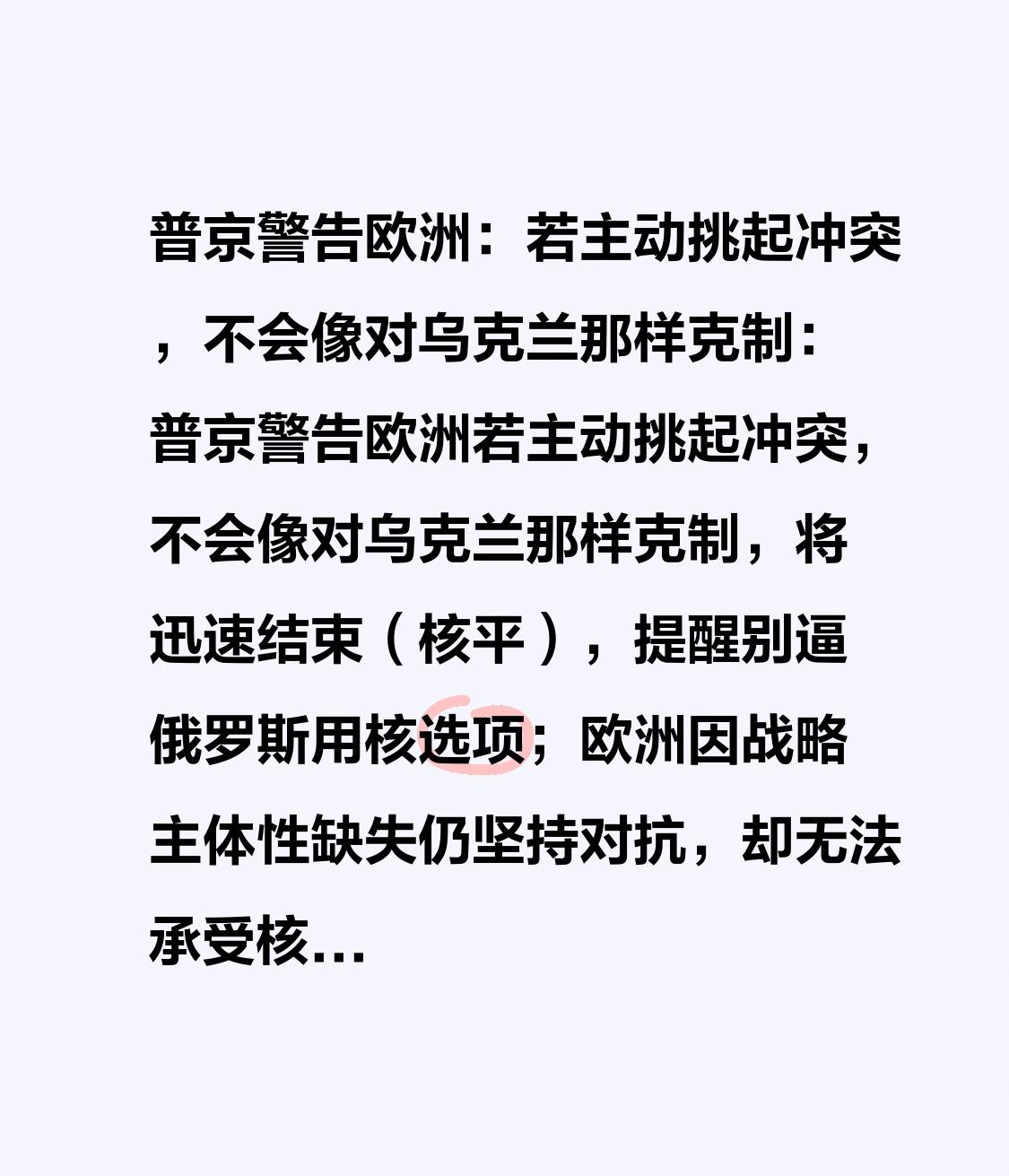 普京警告欧洲:若主动挑起冲突,不会像对乌克兰那样克制:普京警告欧洲若主动挑起冲突,不会像对乌克兰那样克制,将迅速结束(核平),提醒别逼俄罗斯用核选项;欧洲因战略主体性缺失仍坚持对抗,却无法承受核怒火代价。