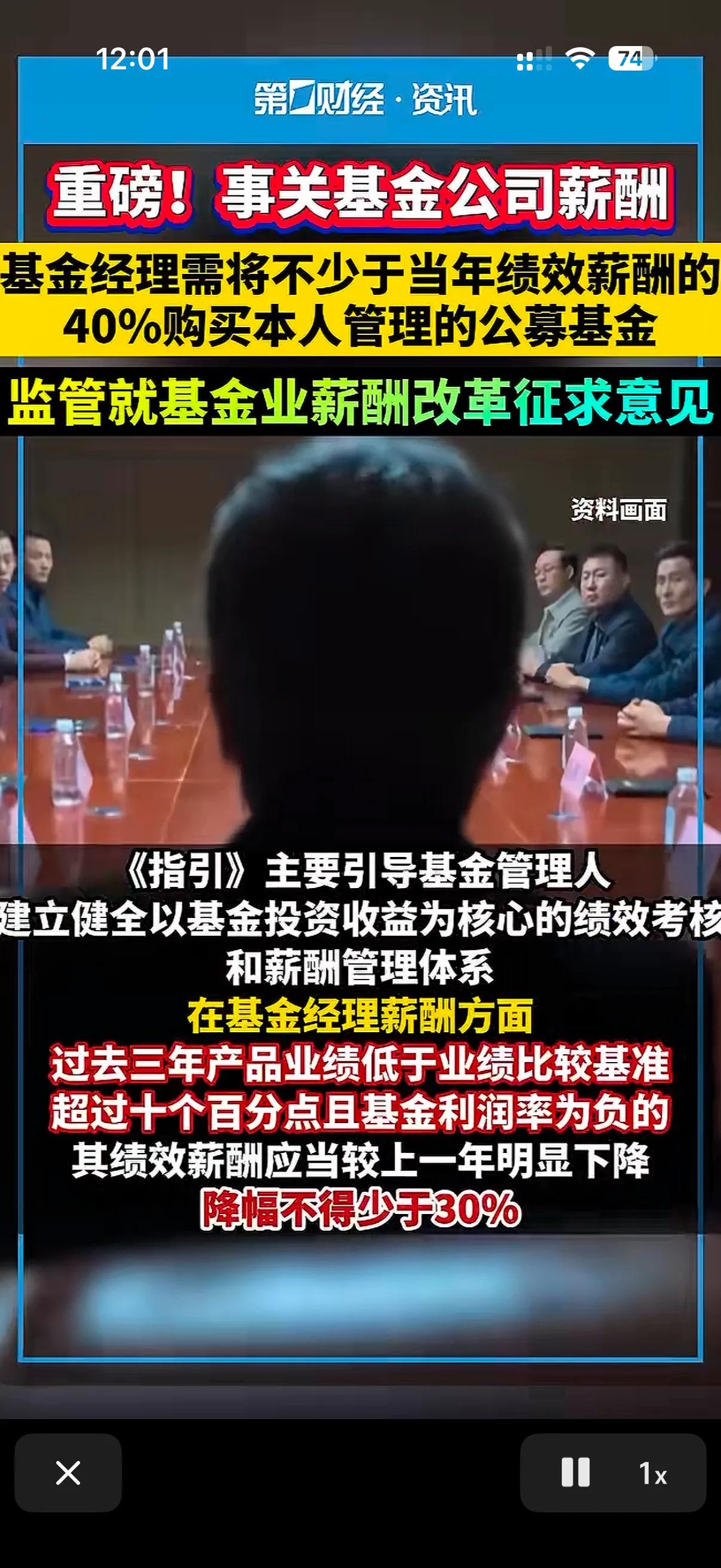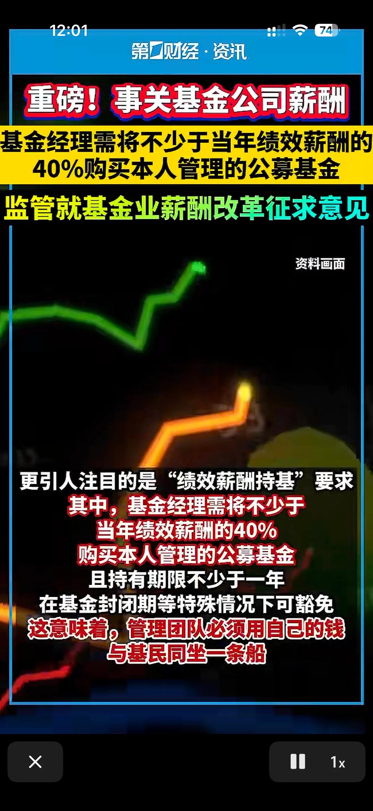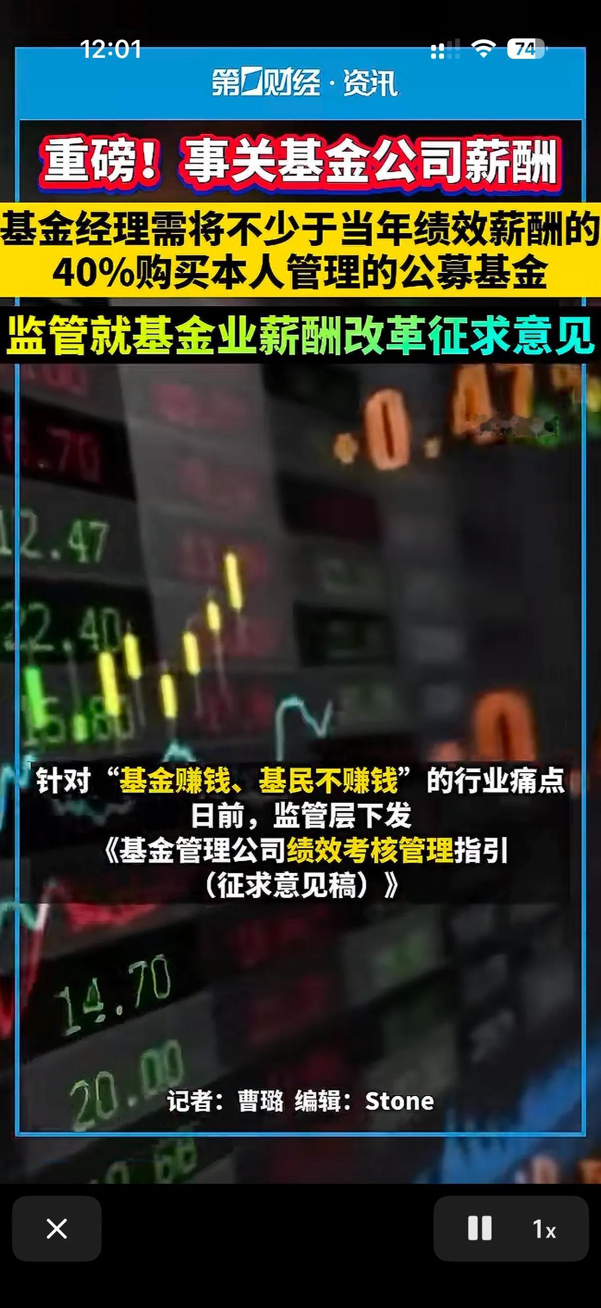 下周买基金的投资者该高兴了!终于有人开始限制基金经理了! 买基金的投资者最生气的是什么!就是自己买的基金亏的亲妈都不认识了,可是基金经理不但是年薪千万,年底居然还有分红!甚至还有高额奖金,凭什么啊! 现在好了!基金新规出来了! 以后基金经理的工资也不在是基金公司自己说了算了!而是要薪酬绩效了!如果基金经理操作的基金过去三年产品业绩低于业绩比较基准超过十个百分点甚至还是负的话,那么薪酬就要下降至少百分之三十! 而且基金经理每年还必须拿出百分之40的绩效购买自己的基金!这下好了,可以说虽然不能杜绝基金经理的暗箱操作,但是绝对能让基金经理们不敢在胡乱操作了,不然一到年底购买基金的投资者看见自己的基金亏钱,但是基金经理赚的盆满钵满的那是心里真的难受!