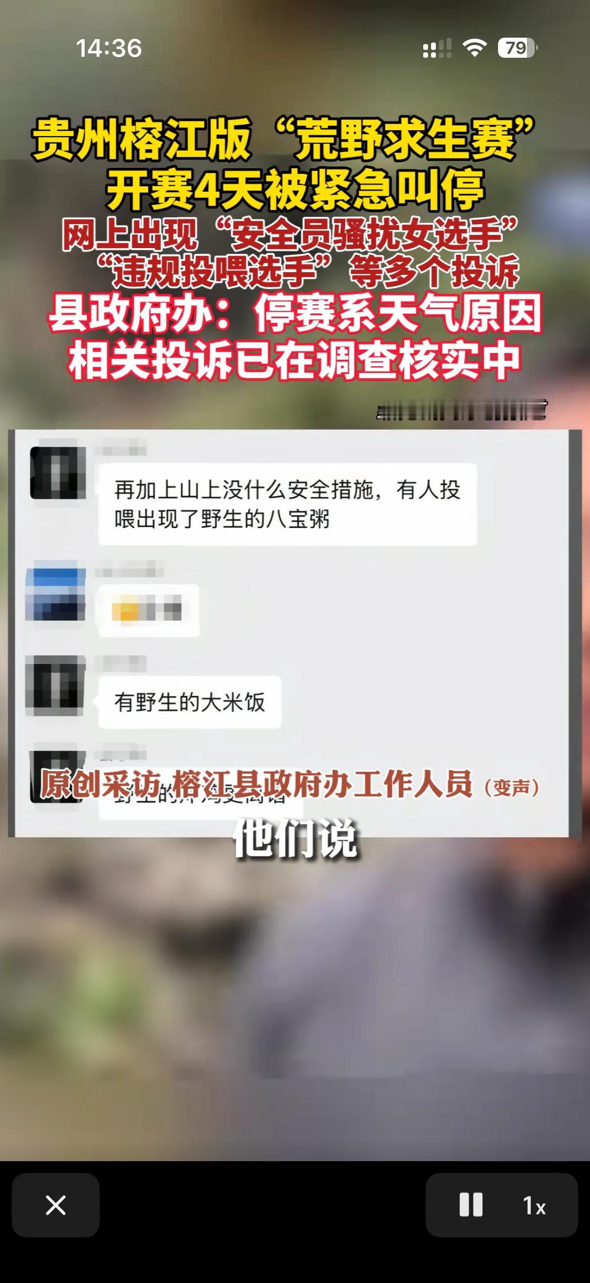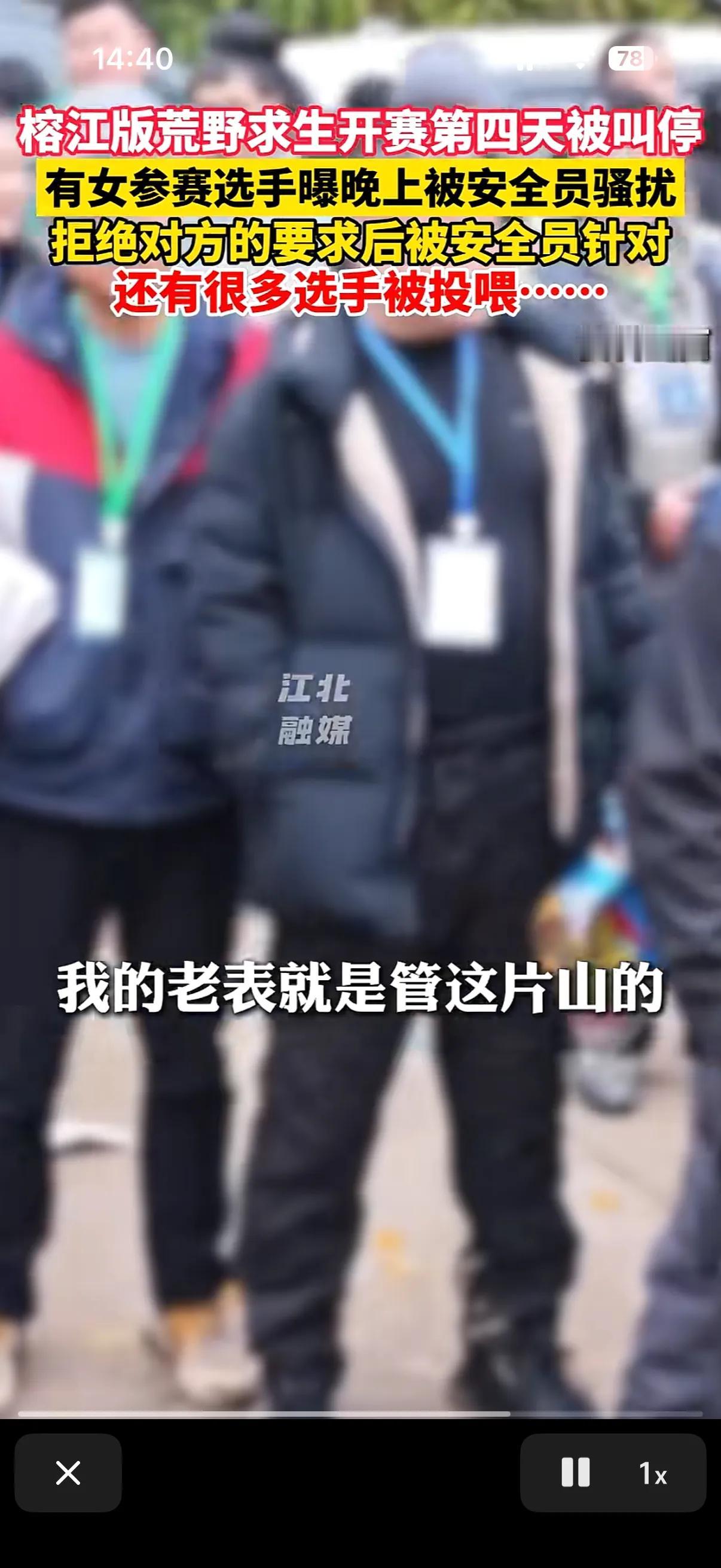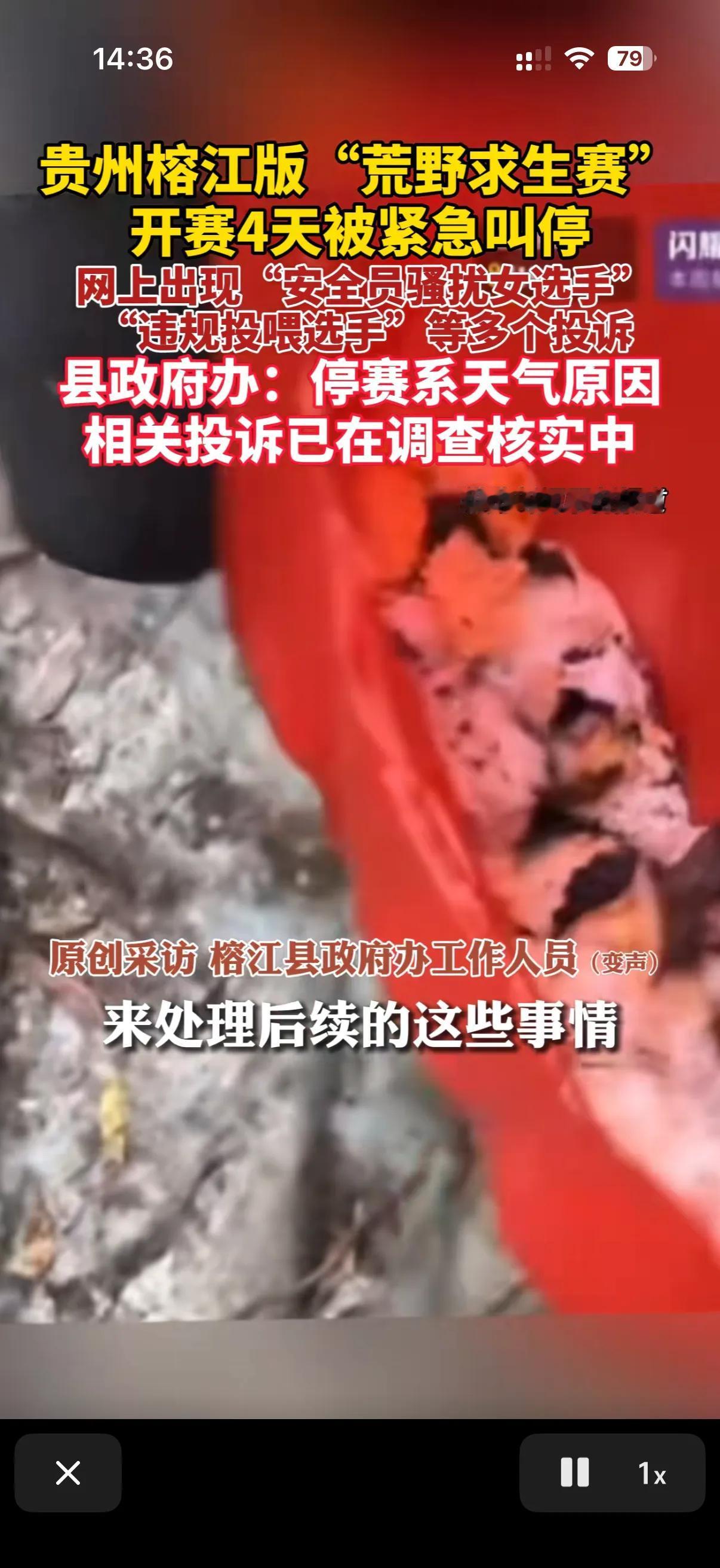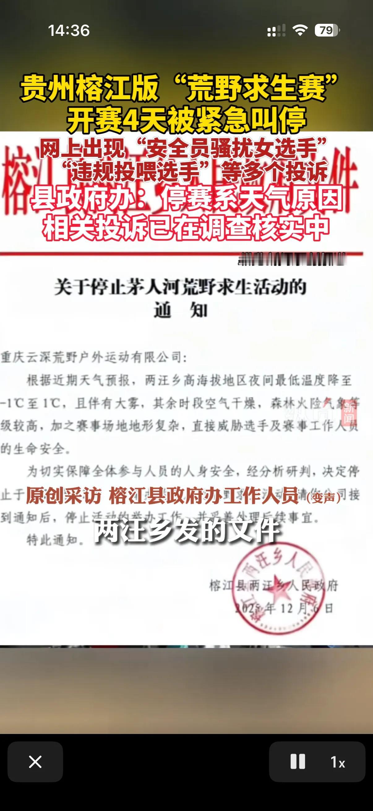 荒野求生比赛被紧急叫停了! 在榕江举行的荒野求生比赛被紧急叫停了! 当地部门出通告说榕江的荒野求生比赛之所以被叫停,是因为天气原因! 可是参加荒野求生比赛的选手说辞却是大相径庭! 有不少参加了榕江荒野求生比赛的选手称,比赛十分不正规,里面还存在了有人在暗中投喂比赛选手! 其中的安全员竟然给比赛选手送火腿肠和米饭~! 甚至还有安全员利用职务之便骚扰和猥亵女参赛选手!选手不从之后,安全员就利用职务刁难女选手! 当记者询问是否属实之后,接电话工作人员称正在调查! 可以说这次荒野求生比赛看出了并不是所有机构都适合举办荒野求生! 不过大家还是冷静吃瓜!坐等当地调查结果!