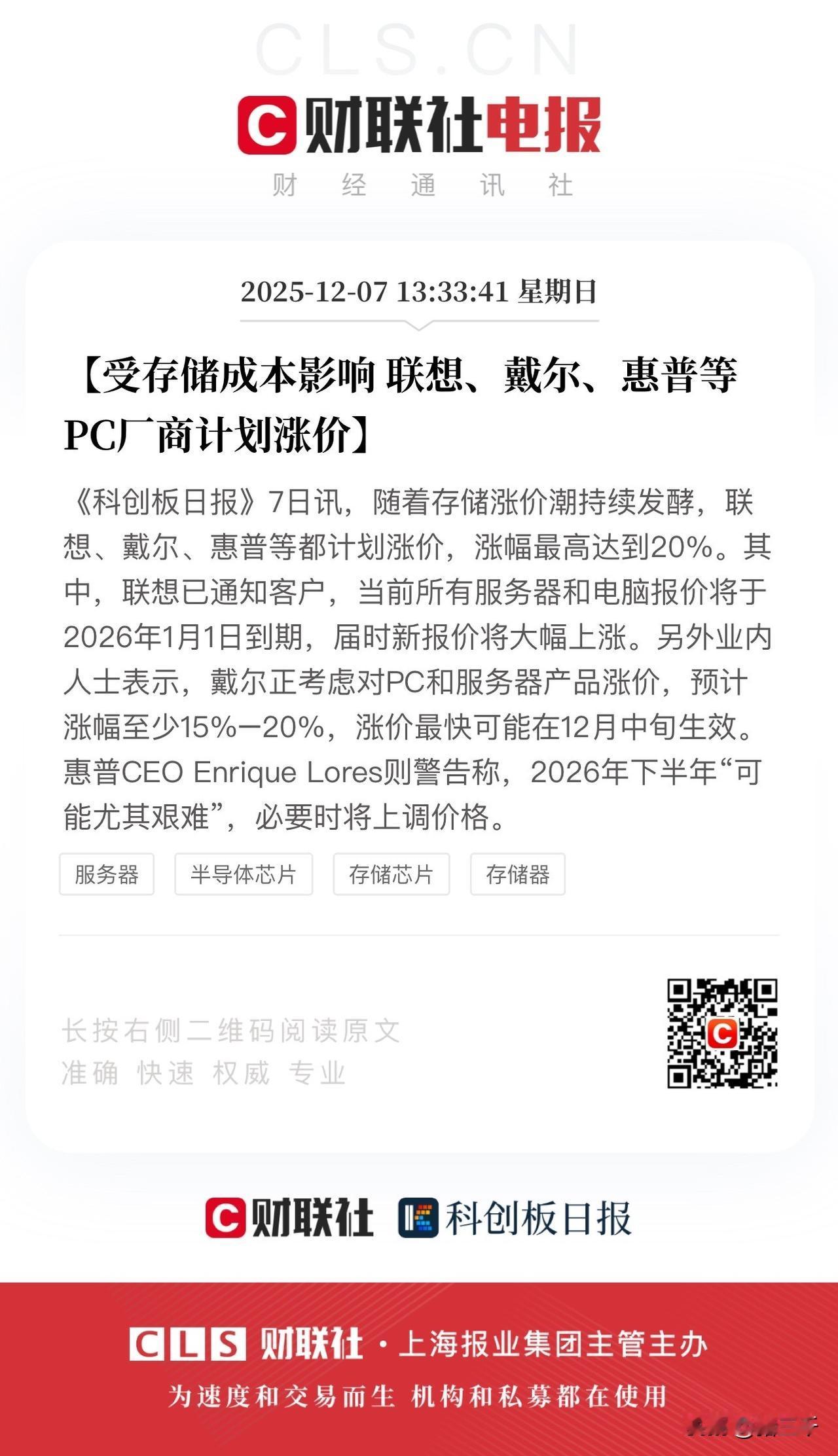 存储涨价继续吹风, 这一次却有不同之处! 在HBM、DDR5涨价逻辑不变的趋势下, 这一次分析师集体唱多消费电子的中低端存储。 联想、戴尔、惠普PC龙头计划提价。 二手笔记本电脑市场生意估计火爆, 内存条、GPU都成了保值增值的理财产品了! 想想几年前PC堆积如山卖不出去, 现在反倒成了抢手货, 所以做生意真的是有门道的, 靠一腔热情肯定不行, 得把握行业周期。 不过联想电脑确实耐用, 第一台联想笔电用了7年下岗, 第二台RTX9000是2020年买的继续服役。 戴尔品牌力越来越差, 惠普的笔记本也耐用。 … 言归正传, 高端存储行情维持到2026年3季度问题不大。 中低端存储就不好说了, 按经验看通常难超3个季度, 还有2个季度好日子? 股价已经严重透支了吧! 兆易创新、澜起科技DDR5、雅克科技上游原材应该错不了,还可以深挖! …