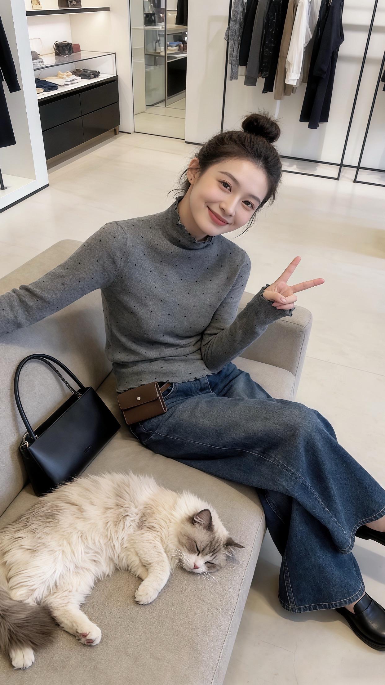 清新夏日穿搭,白色露肩上衣搭配牛仔短裙,坐在柔软的地毯上,享受悠闲时光。