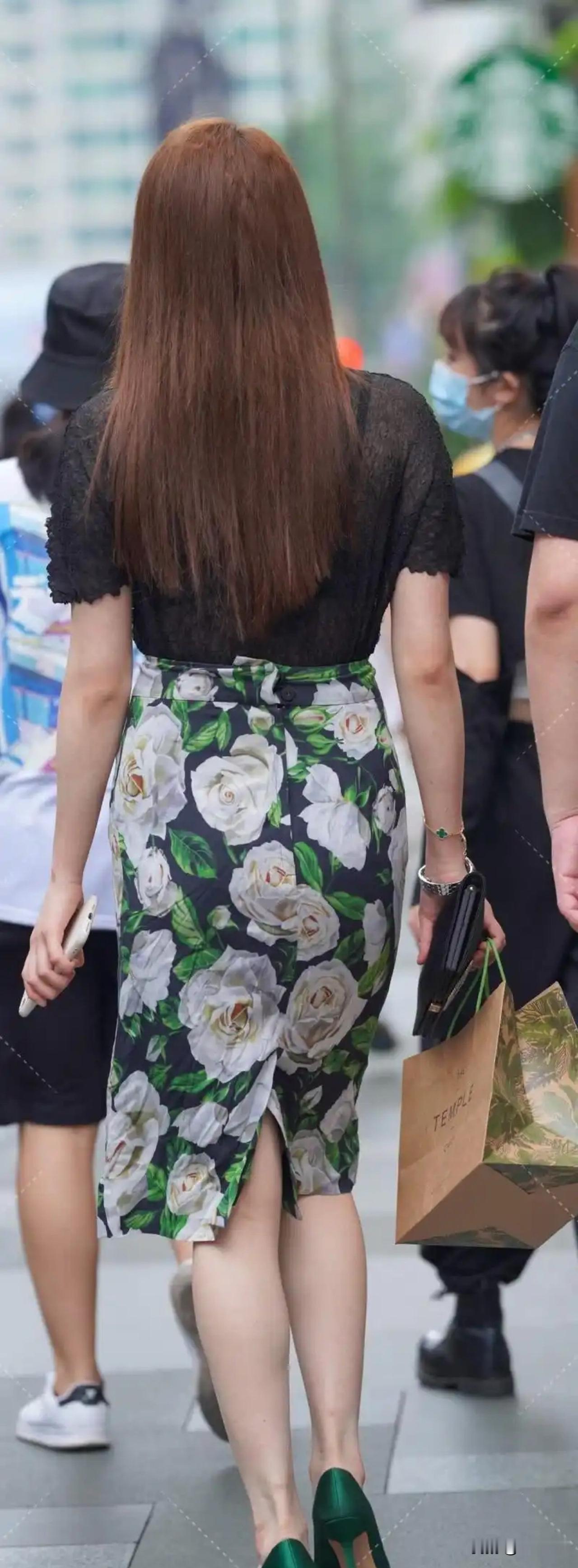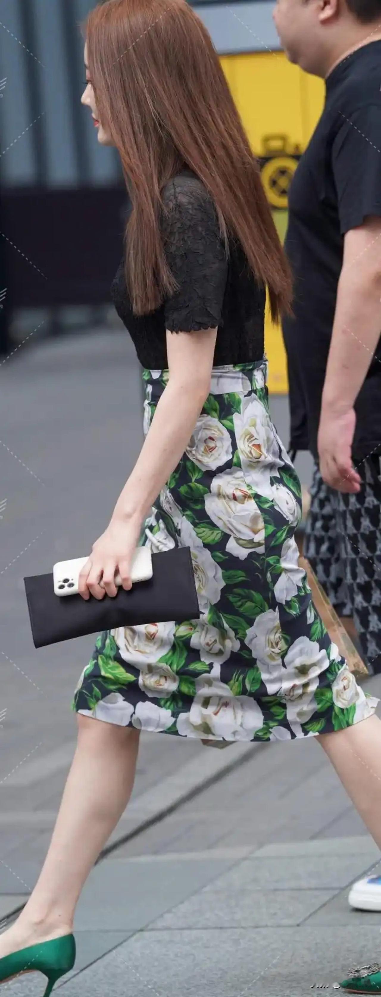 绿意盎然的花卉裙搭配亮眼绿高跟鞋,都市街头的一抹亮色。
