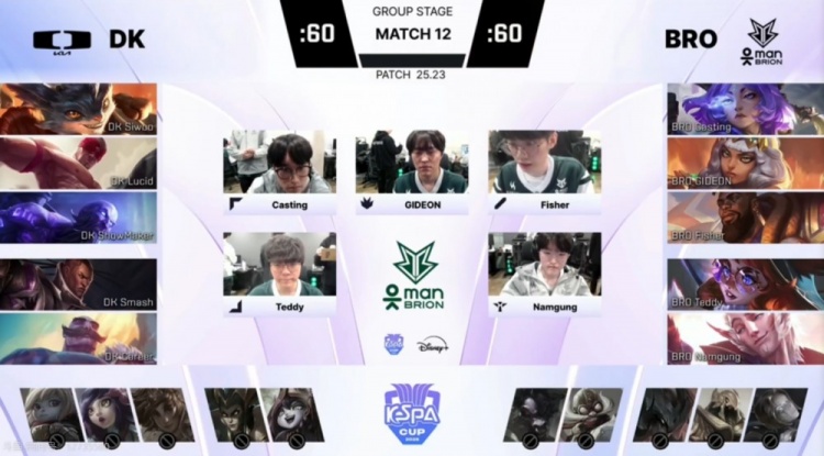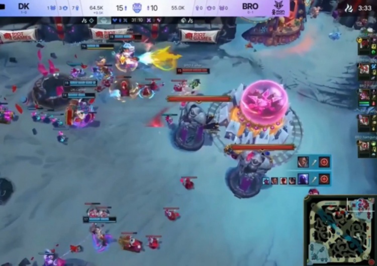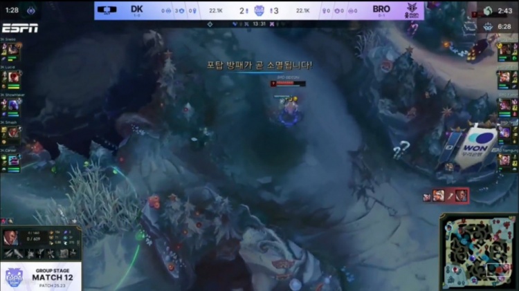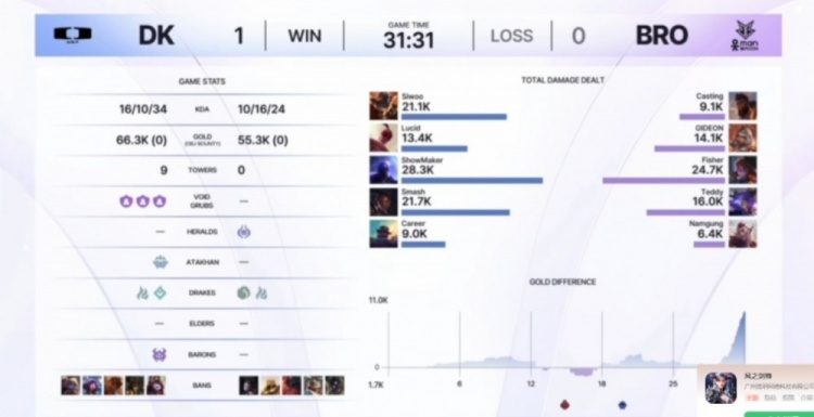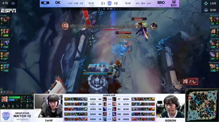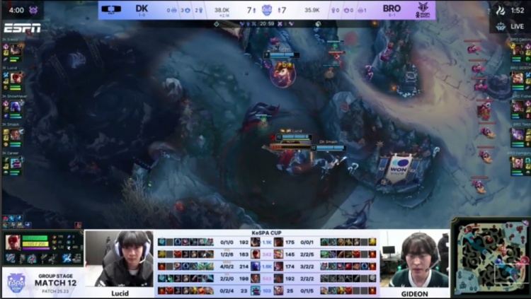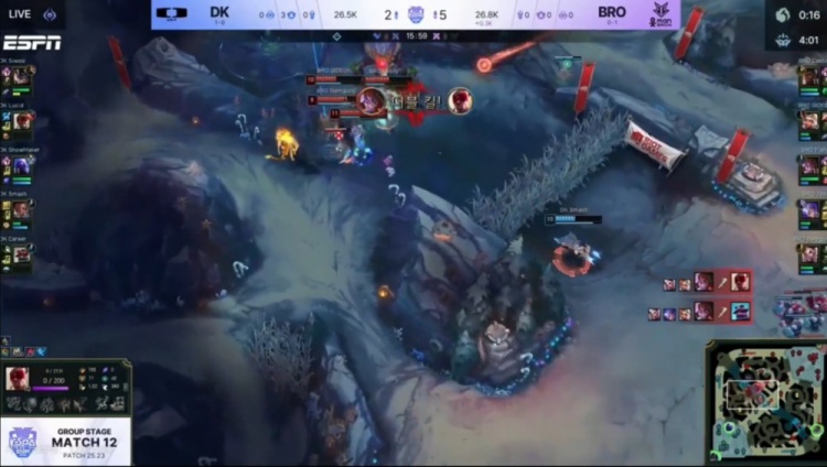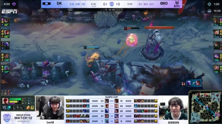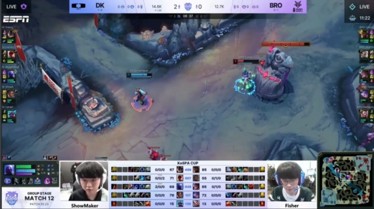 [22:16]上路混战,DK野辅瞬间睡着,Fisher阿萝拉开大配合GIDEON奇亚娜开大双杀,BRO回头拿到小龙,经济落后1k。