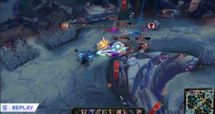 [12:52]野区混战,Lucid盲僧R闪踢到Namgung洛,GIDEON奇亚娜推到Lucid后将其击杀,紧接着Smash路线下路河道又被GIDEON逮捕,BRO打出0换2。