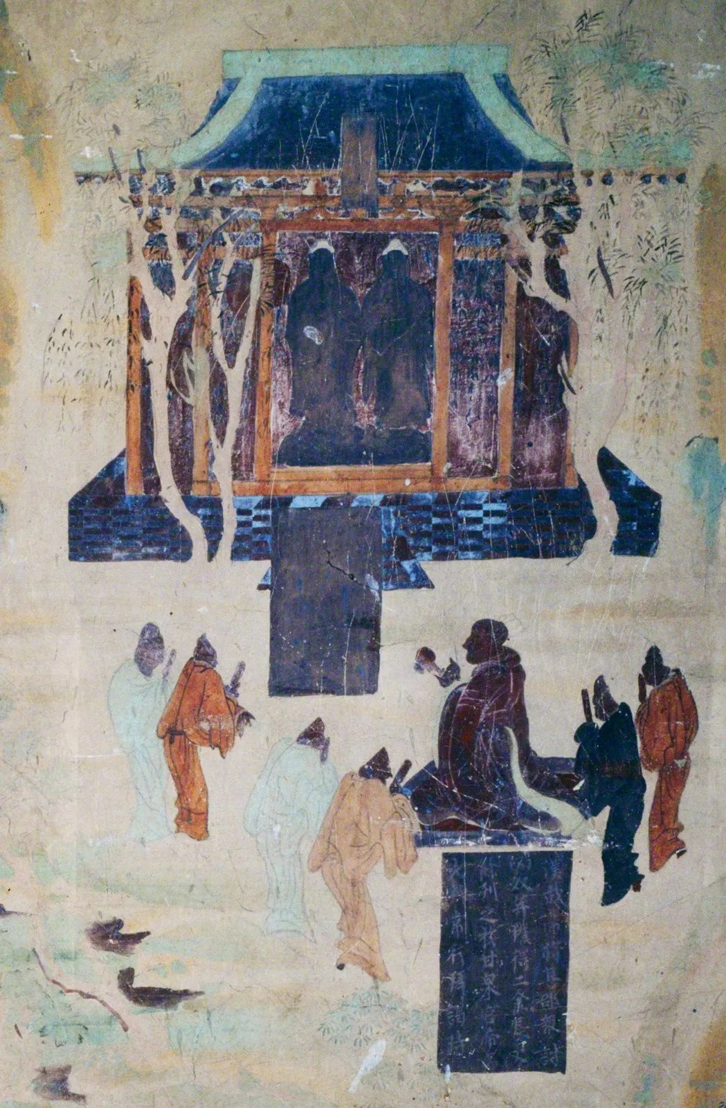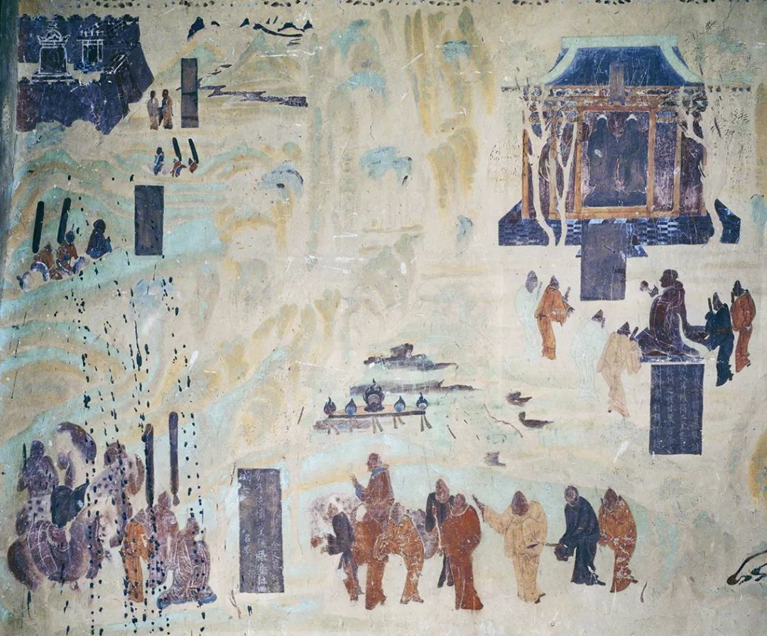 敦煌莫高窟唐初323窟是仅存的“佛教历史”题材洞窟, 壁画绘制了“张骞出使西域图”, 实际上作者把出使西域附会成佛教传播入中原. 历史上记载的正式佛教传入是在东汉明帝时期(58-75年),遣使者入大月氏,请高僧迦叶摩腾和竺法兰,白马载经入汉.公元68年在洛阳建第一座佛教寺院:白马寺