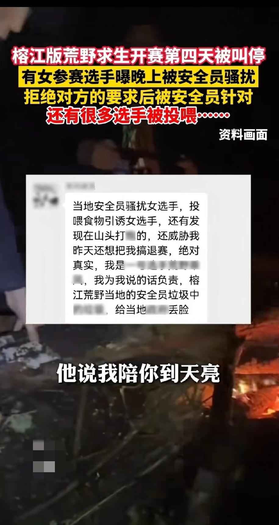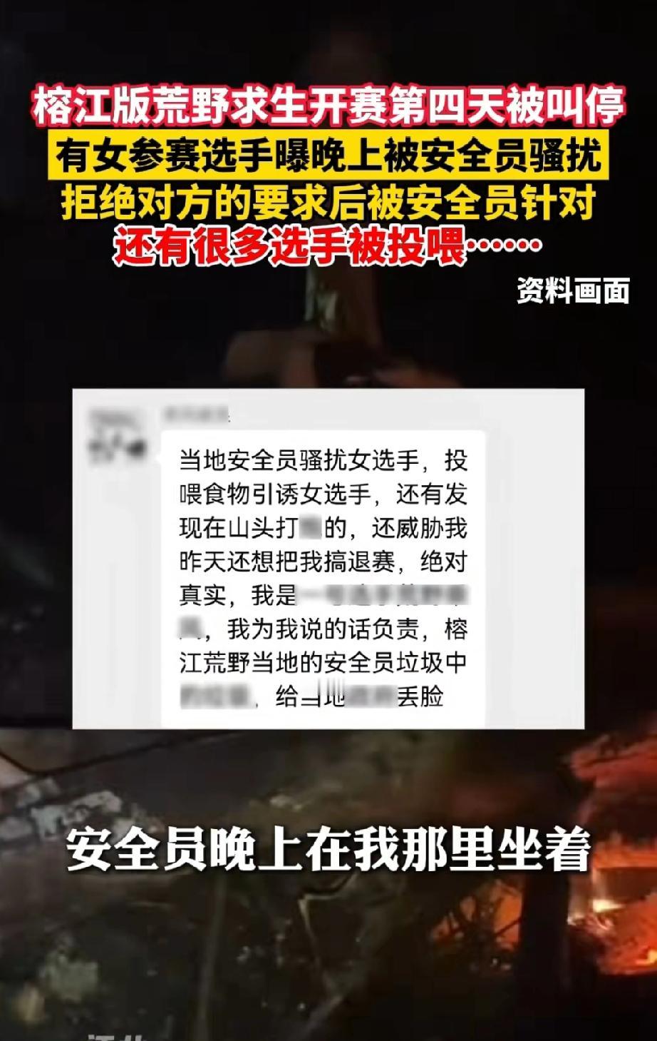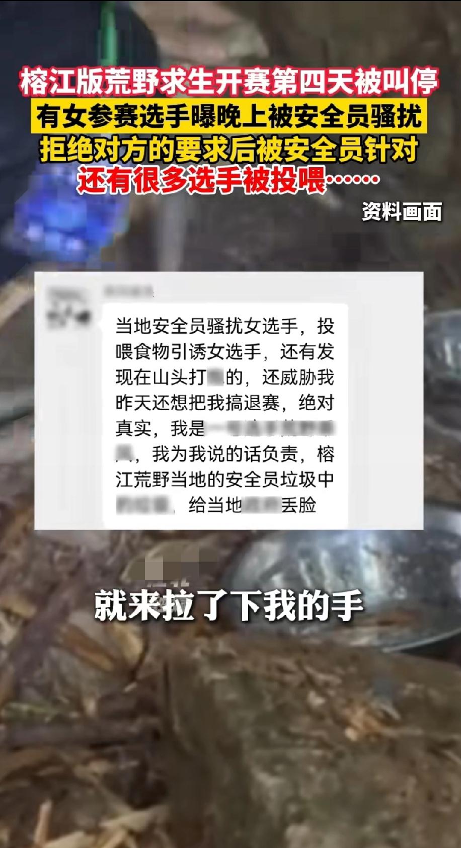 榕江荒野求生被爆安全员骚扰女选手,暗示潜规则可以给吃的。 同时该荒野求生赛事儿已经因为安全隐患被当地叫停。 诶,可能这就是人性吧,手头有一点点小小的权利,就喜欢为难别人,受益自己。 我觉得,接下来其他地方的荒野求生应该吸取教训,安全员全程录音录像,并且,女选手由女安全员看护。 荒野求生比赛