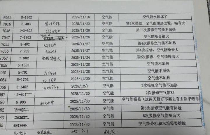 近日都市快报报道了《“我已经二十多天没用过家里的热水了!”杭州一精装新楼盘,空气能热水器坏了一大片,开发商说只修不换,业主很无语》,今年十月份业主钱先生搬进春境前潮,只用了两天的热水器就出现了问题,前后修了两次都没解决,只能自己烧水或开个钟点房洗澡。维修师傅告诉他,该款热水器没有新的配件,只能从旧机器中拆解配件使用,但不保证还会出问题。事实上该业主只使用了一天就又出现了问题,热水供不上。上门维修师傅说,今天要修十五家,都是这个小区,名单上有人已有5次维修记录,最少的也有2次。