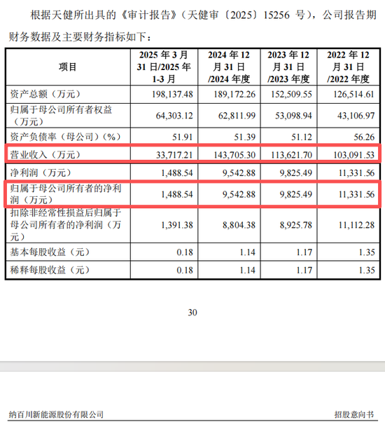 2022年至2024年及2025年第一季度,纳百川的营业收入分别为10.31亿元、11.36亿元、14.37亿元及3.37亿元,归母净利润分别为1.13亿元、9825.49万元、9542.88万元及1488.54万元。