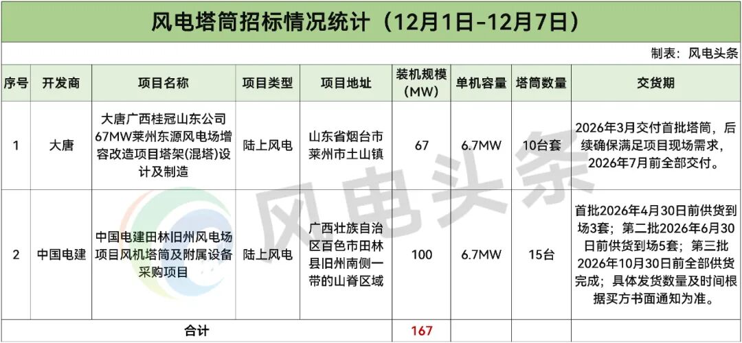 根据招标公告,大唐广西桂冠山东公司67MW莱州东源风电场增容改造项目位于山东省烟台市莱州市土山镇,建设规模67MW,招标范围:10台套6.7MW风力发电机组(叶轮直径220米,轮毂高度166米)塔架设计及制造(从风机基础顶面±0.00m至机舱底部法兰)运输。交货期:2026年3月交付首批塔筒,后续确保满足项目现场需求,2026年7月前全部交付。