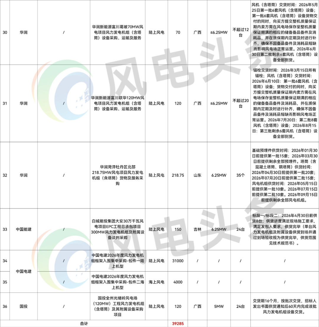 华润宁夏中卫硅基特色优势产业绿电园区200MW风电项目位于宁夏中卫市海原县树台乡、关庄乡、红羊乡境内,风机机位数量32个,采用单机容量6.25MW的机型,单位千瓦扫风面积不低于6.08m2/kW,风机叶轮直径不高于223米,风电机组叶尖离地高度不低于14米,塔型为钢制刚性塔,总容量为200MW。交货期/工期:(1)锚栓、锚板交货:2026年3月15日前,到货16套;2026年4月15日前,到货16套。(2)塔筒、风电机组交货:2026年4月15日前,到货10套;2026年5月15日前,到货10套;2026年6月15日前,到货12套。(吊具满足现场吊装需求,含技术资料以及备品备件)。