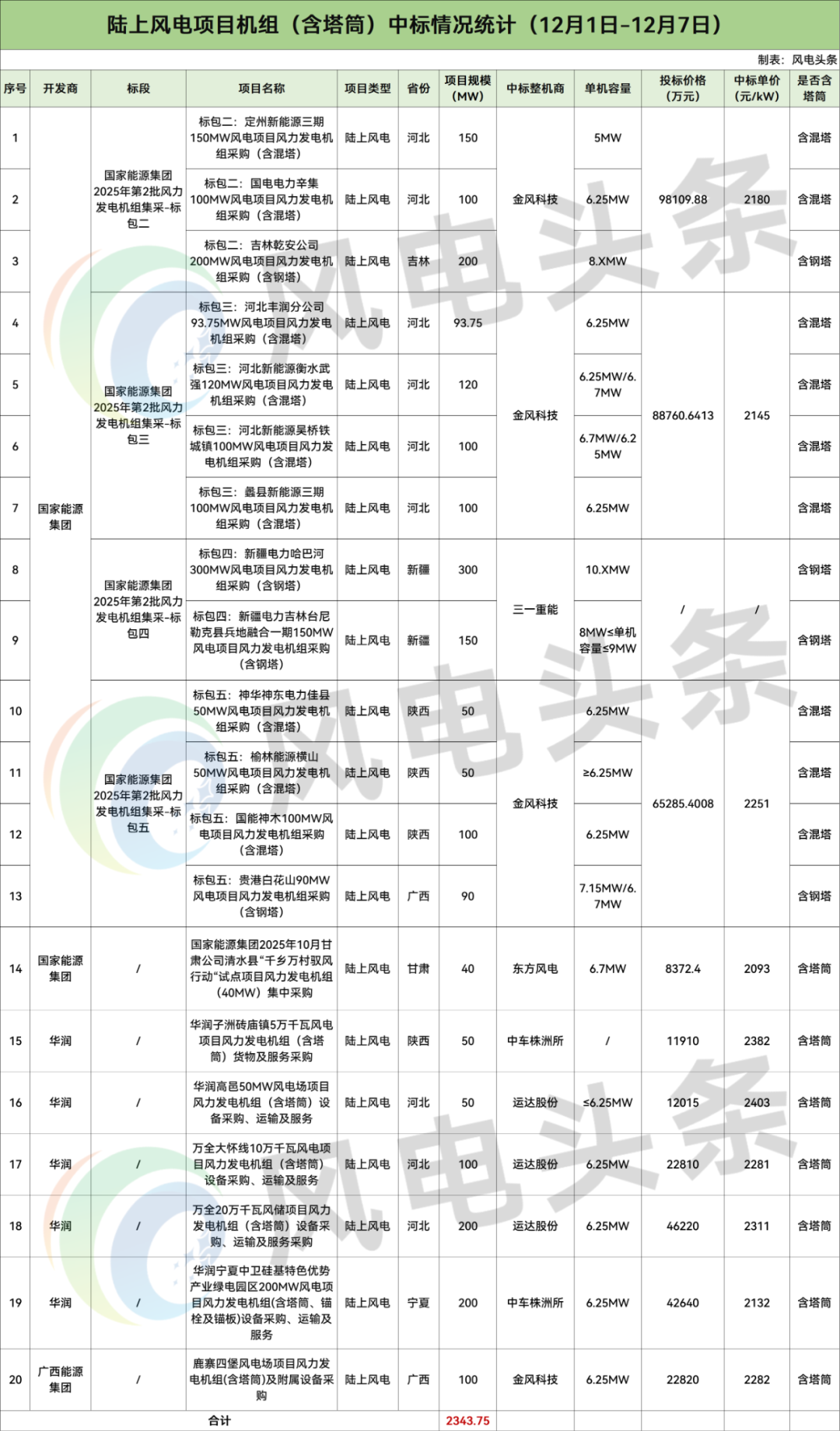 据风电头条统计,本周含塔筒陆上风电项目共计20个,规模总计2343.75MW,项目中标均价为2246.08元/kW。