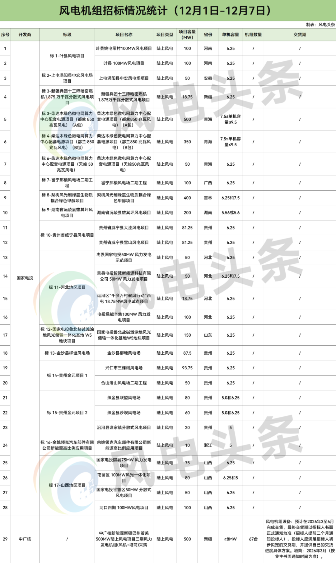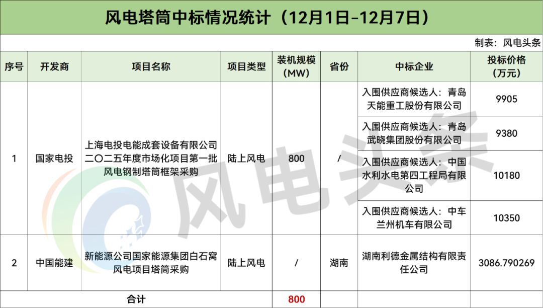 据风电头条统计,12月1日-12月7日风电整机采购开标总计9993.75MW,风电机组招标总计39285MW;风电塔筒开标总计800MW,风电塔筒招标总计176MW。