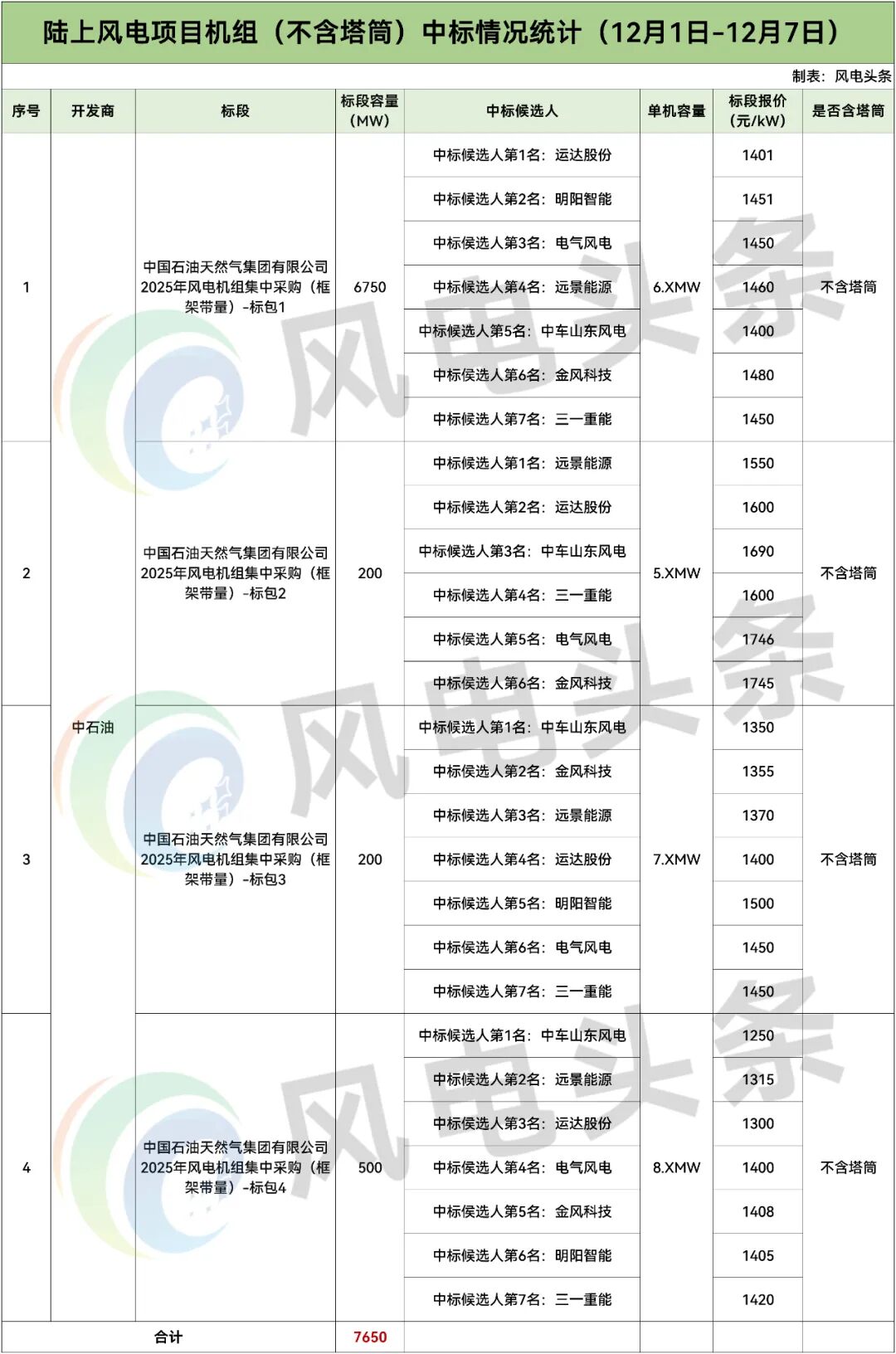据风电头条统计,本周不含塔筒陆上风电项目为中石油2025年风电机组集中采购(框架带量),共4个标包,规模合计7650MW。