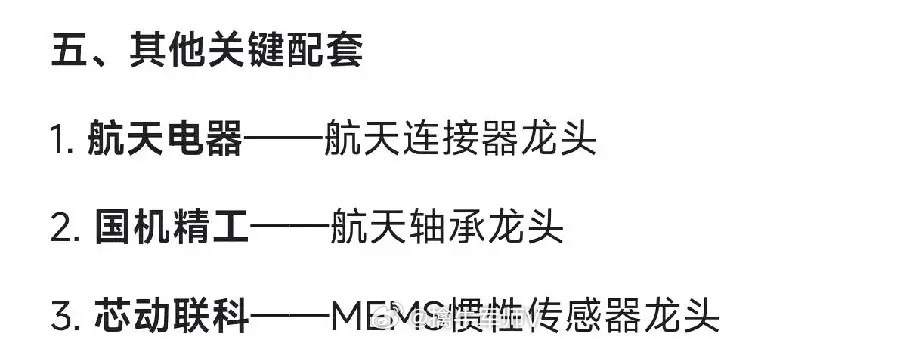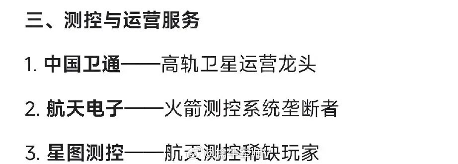 商业航天概念细分龙头汇总:一、卫星制造与核心部件1. 中国卫星——卫星制造龙头2. 铖昌科技——星载芯片龙头3. 乾照光电——卫星能源系统龙头二、火箭发射与配套1. 航天动力——液体火箭发动机龙头2. 斯瑞新材——火箭材料隐形冠军3. 超捷股份——火箭结构件龙头4. 铂力特——火箭发动机3D打印龙头三、测控与运营服务1. 中国卫通——高轨卫星运营龙头2. 航天电子——火箭测控系统垄断者3. 星图测控——航天测控稀缺玩家四、应用场景落地1. 中科星图——遥感数据服务龙头2. 航天宏图——AI+航天技术赋能者3. 华力创通——手机直连卫星核心企业五、其他关键配套1. 航天电器——航天连接器龙头2. 国机精工——航天轴承龙头3. 芯动联科——MEMS惯性传感器龙头