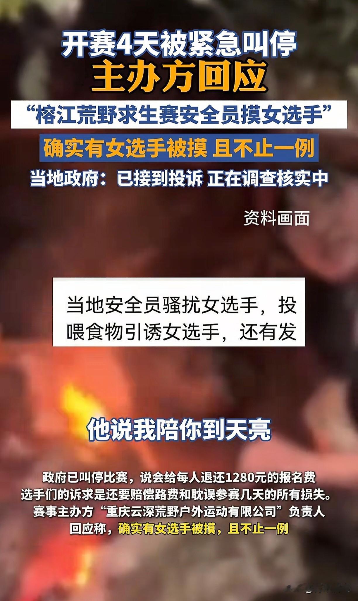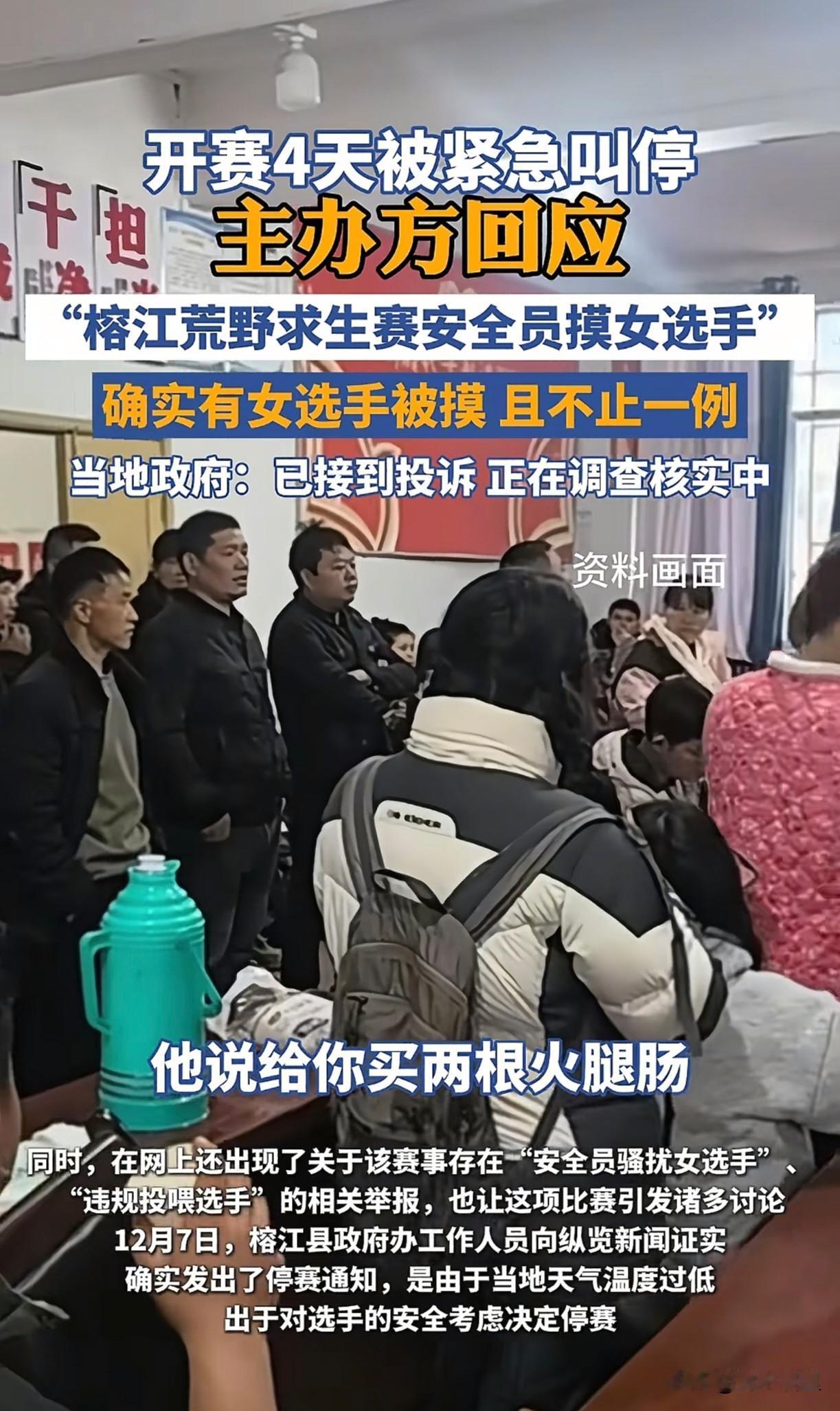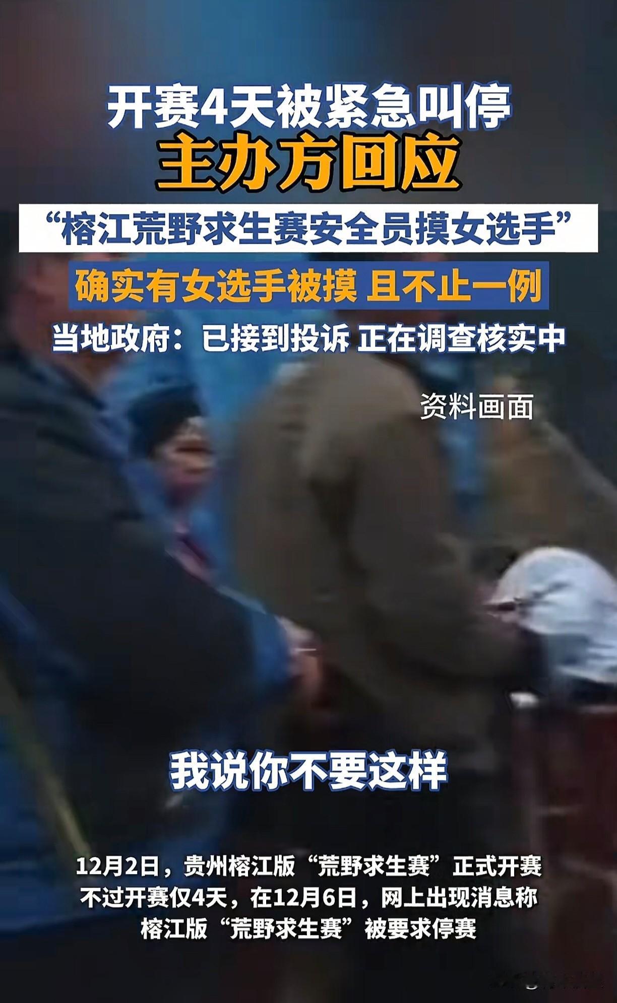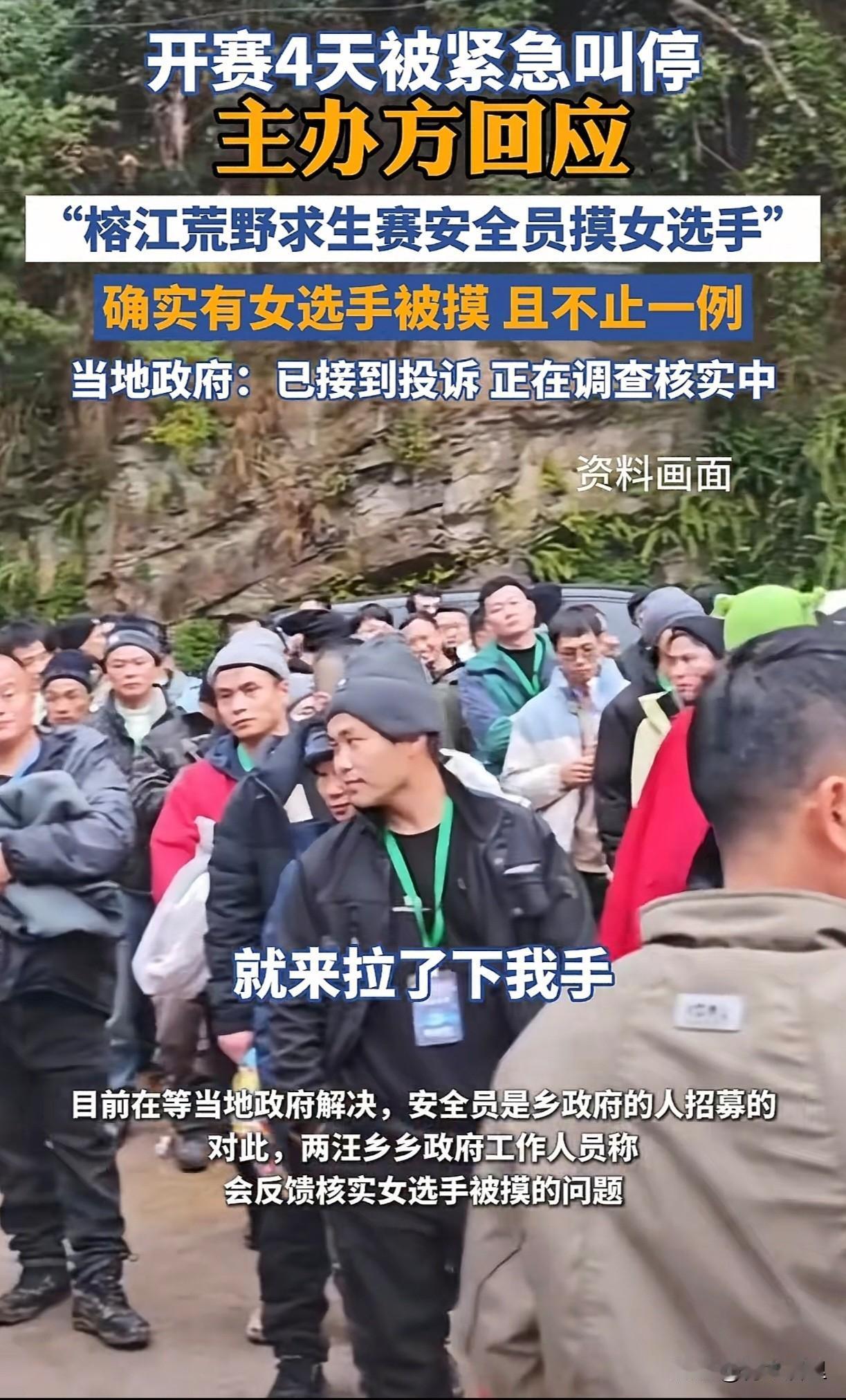 张家界七星山举办荒野求生爆火之后,贵州榕江也效仿举办了荒野求生,想要获得一波流量,报名人员挺多。多么好的一锅粥里,只可惜落了一颗老鼠屎。 刚开赛没有多久,求生赛中的安全员就骚扰多名女选手,拿食物引诱女选手,其中有几个女选手被摸。事情发生后当地政府紧急叫停了比赛,并介入调查。 真让人无语,有些人,稍微有点权利,就不知道自己姓甚名谁了。安全员本应该保护参赛人员,防止意外情况的,没想到却成了最不安全的因素。希望能够调查清楚,严肃处理,给参赛人员一个合理结果。