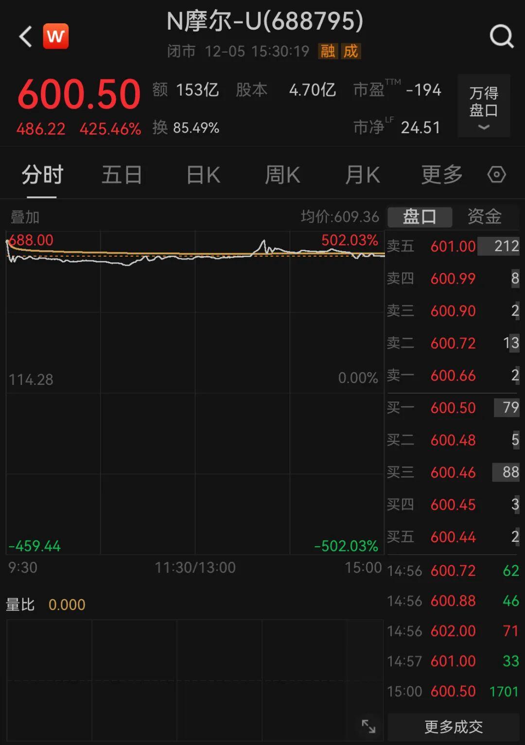 12月5日,摩尔线程开盘即暴涨,涨幅高达468%。开盘十分钟内,股价一度冲高至688元/股。按发行价114.28元/股计算,若投资者中签(科创板一签为500股),最高单签收益可超28万元。