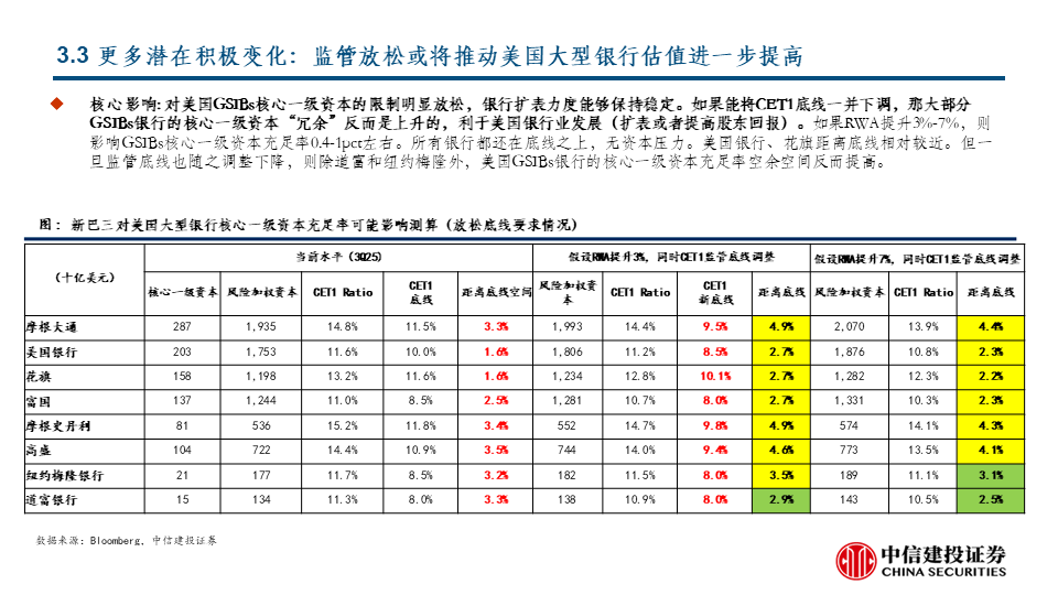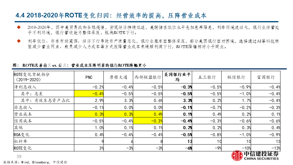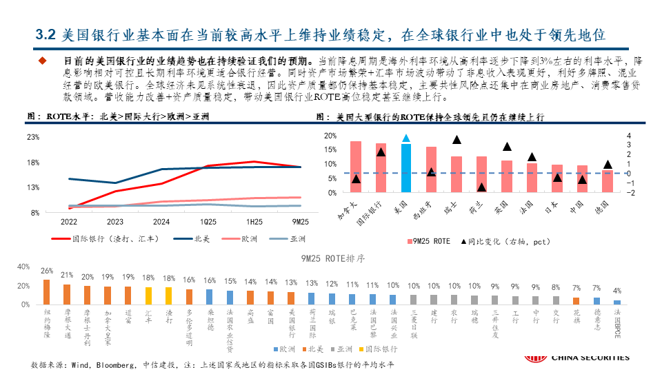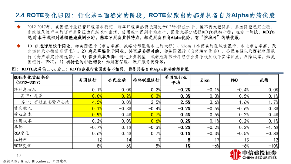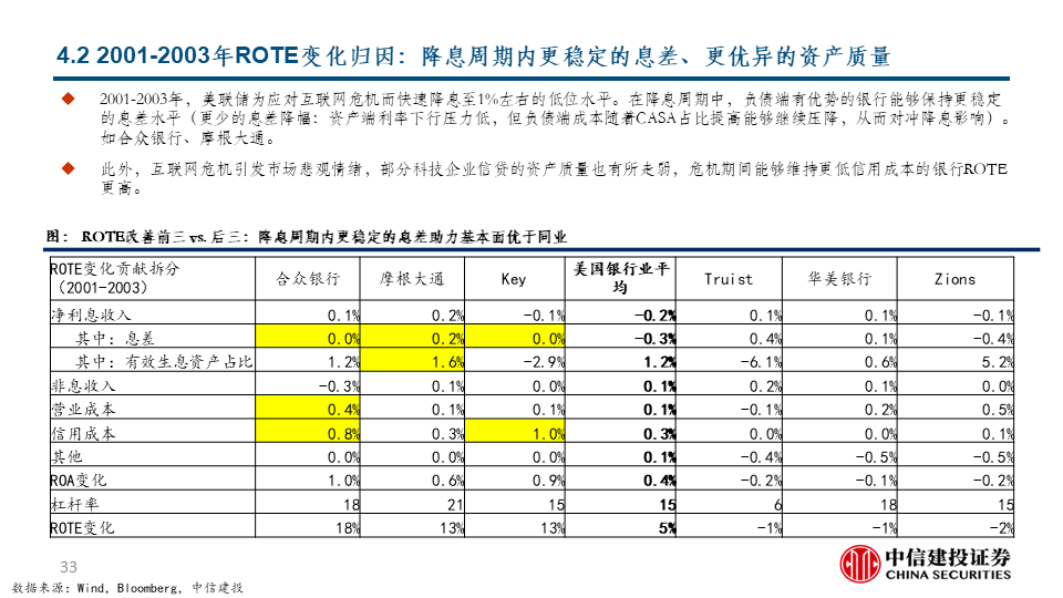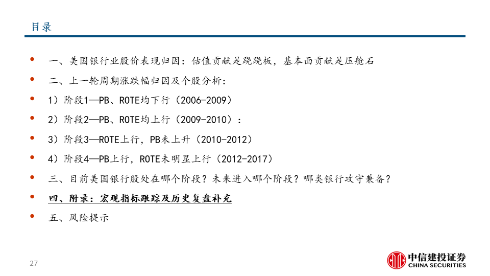 攻守兼备是当前选股重点:历史归因显示,在阶段3和阶段4,美国大行均容易产生优异表现,结合当前各家业绩指引和估值水平,我们预计美国大行是当前阶段攻守兼备的较优选择,尤其是其中处于历史估值水平较低分位数的个股。大行之外,预计能实现ROTE持续改善的银行亦是当前优选。
