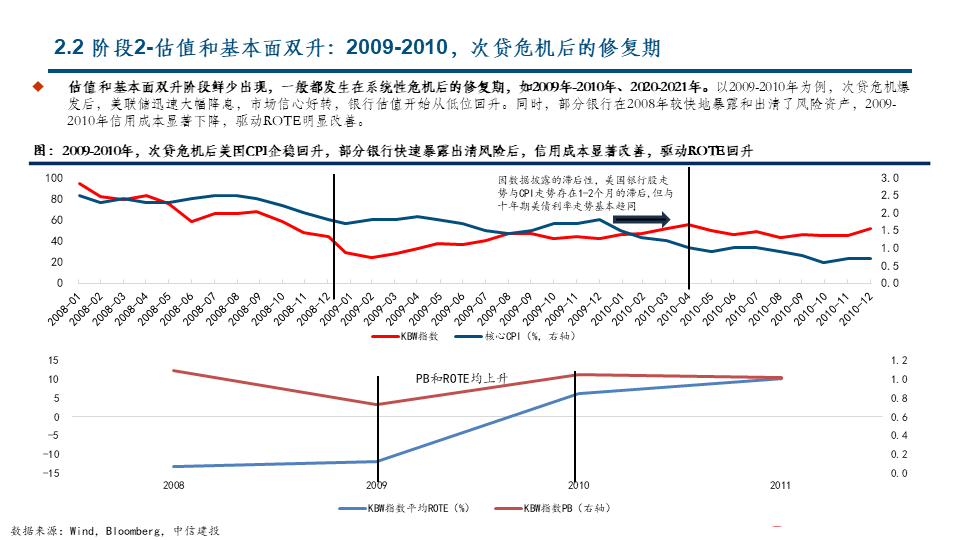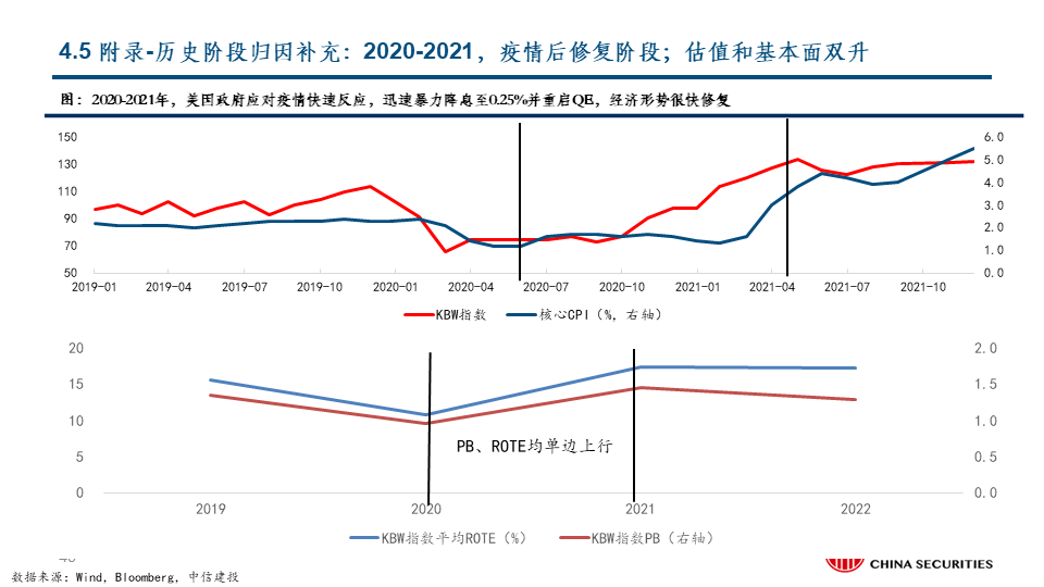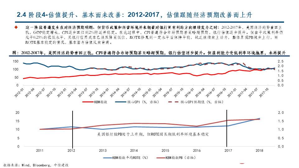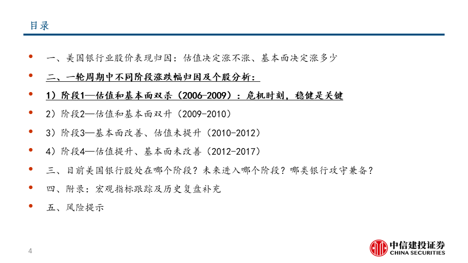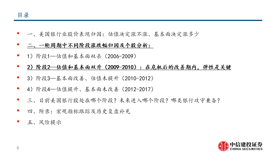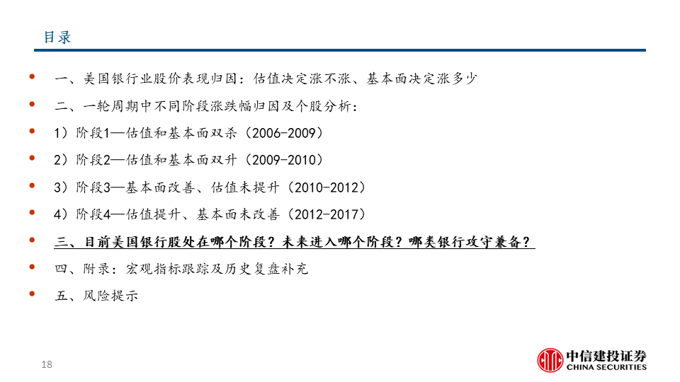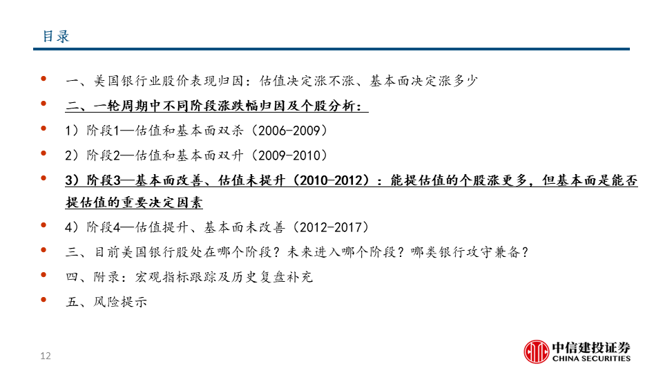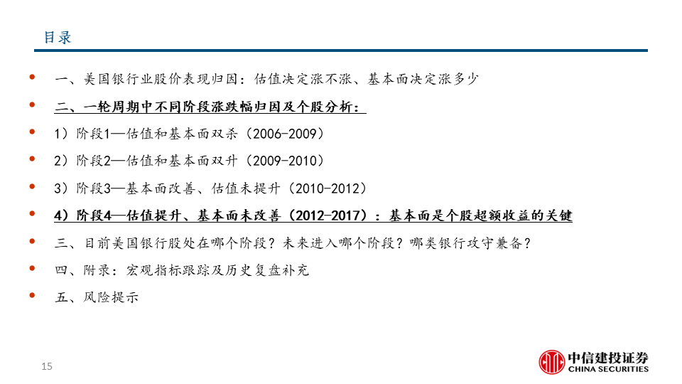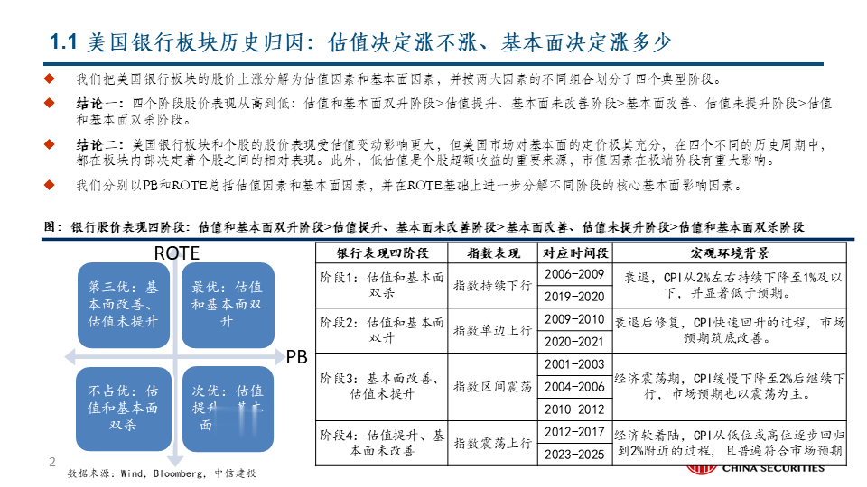 我们把美国银行板块的股价上涨分解为估值因素和基本面因素,并按两大因素的不同组合划分了四个典型阶段。