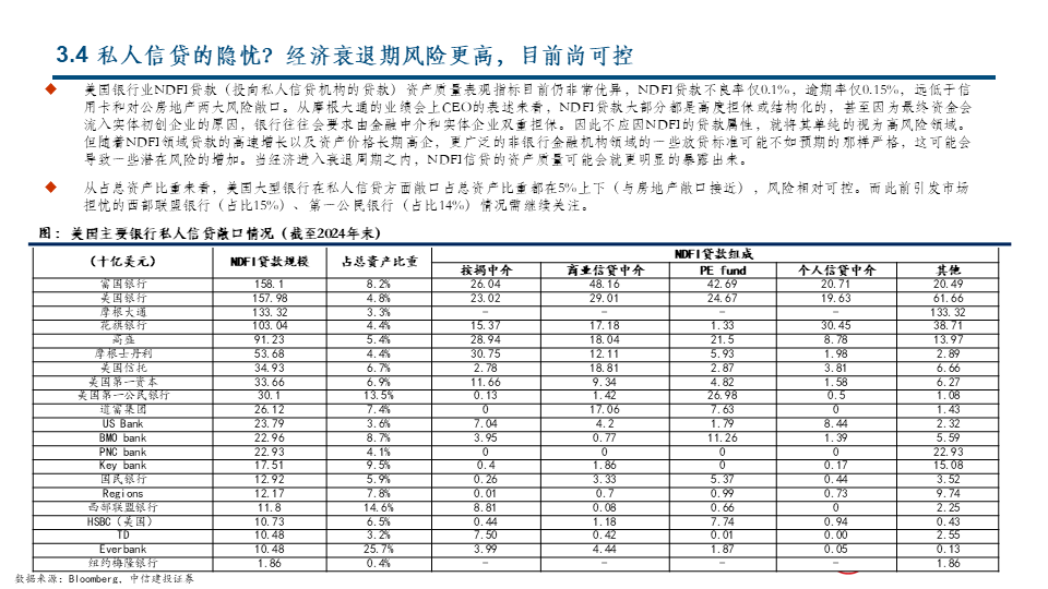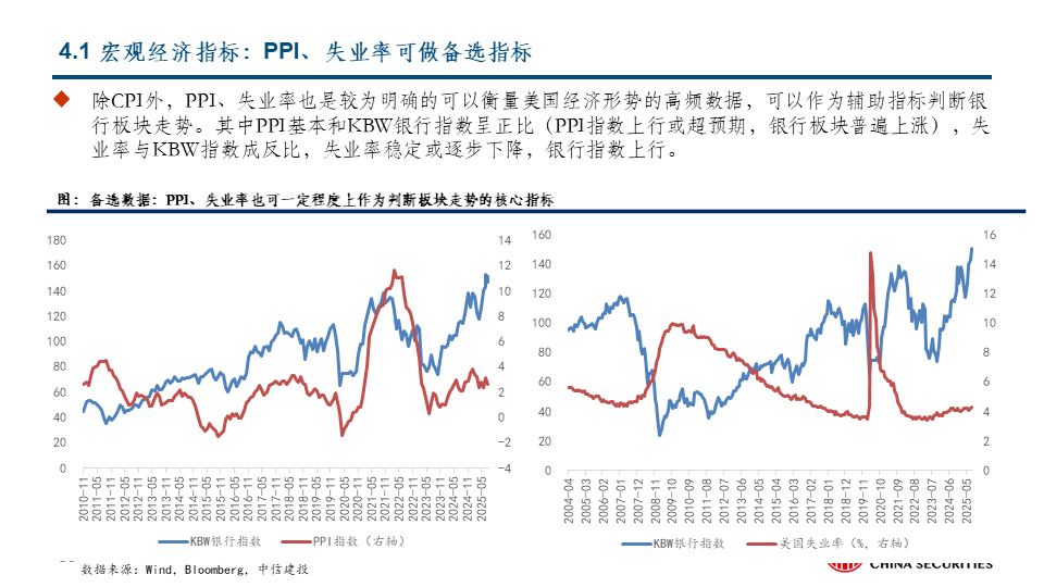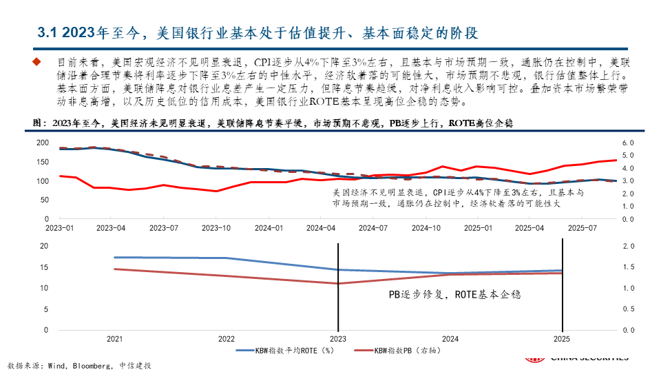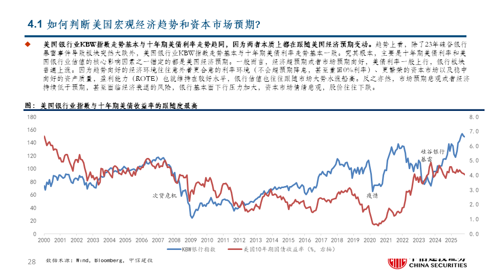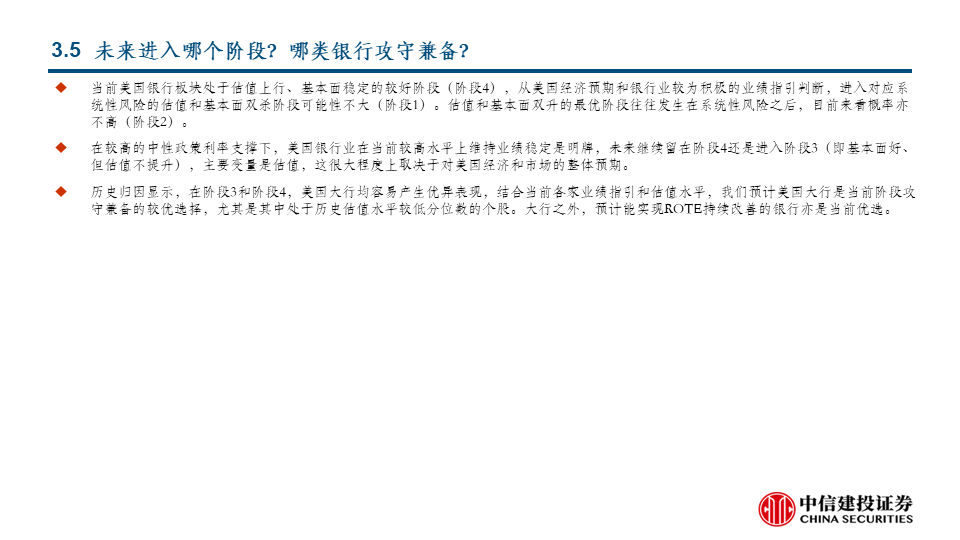 展望未来,最大的可能在阶段4和阶段3之中:我们判断,当前美国银行板块处于阶段4,从美国经济预期和银行业较为积极的业绩指引判断,较为极端的阶段1和阶段2可能性都不大,在较高的中性政策利率支撑和趋向宽松的监管预期下,美国银行业在当前较高水平上维持业绩稳定是明牌,未来继续留在阶段4还是进入阶段3,主要变量是估值,这很大程度上取决于对美国经济和市场的整体预期。