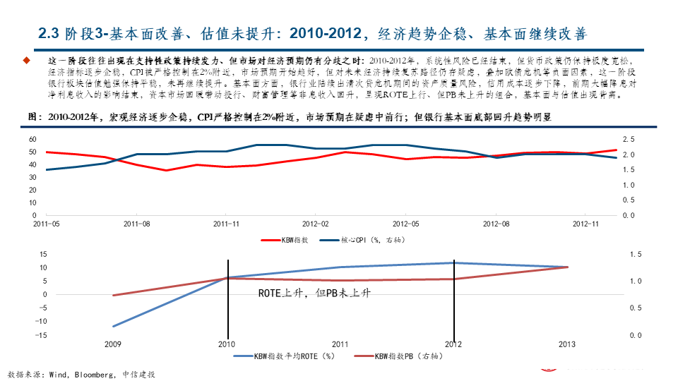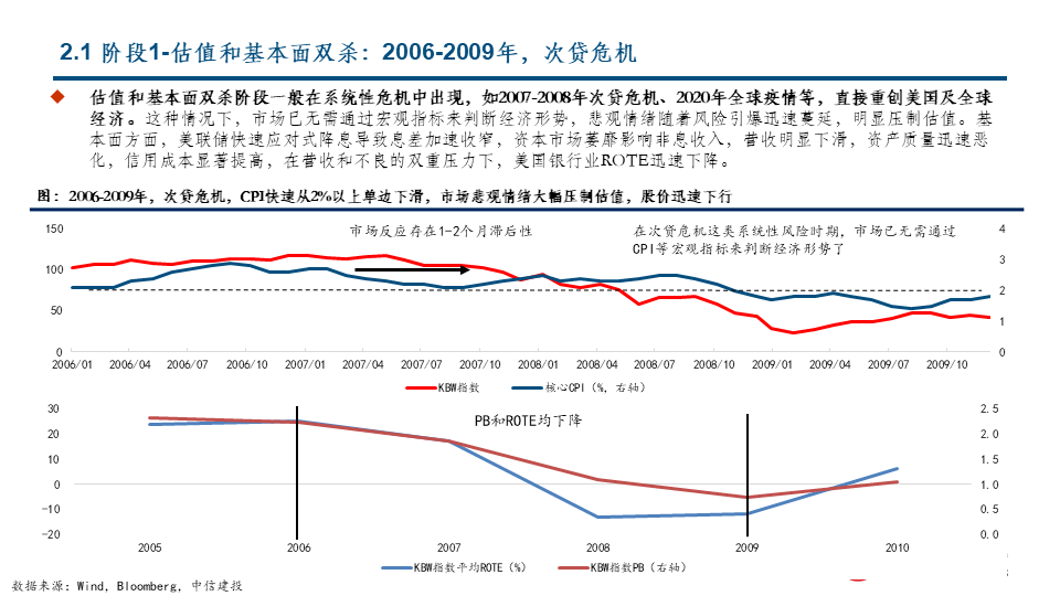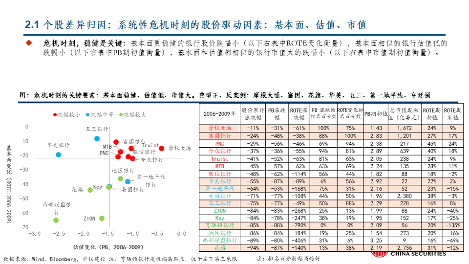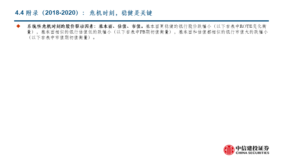 阶段1:板块估值和基本面双杀:危机时刻,稳健是关键:类似次贷危机、全球疫情等系统性风险时刻。在板块内部,基本面更稳健的银行股价跌幅小,基本面相似的银行估值低的跌幅小,基本面和估值都相似的银行市值大的跌幅小。