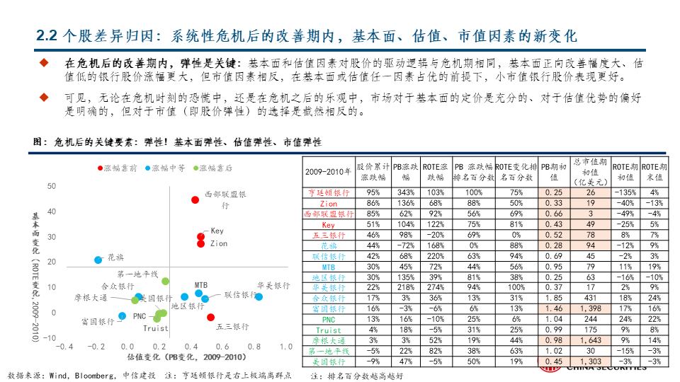 阶段2:板块估值和基本面双升:在危机后的改善期内,弹性是关键:一般发生在系统性危机后的修复期。在板块内部,基本面正向改善幅度大、估值低的银行股价涨幅更大,但在基本面或估值任一因素占优的前提下,小市值银行股价表现更好。可见无论是危机的双杀时刻还是危机后的双升修复期,市场对于基本面和估值的定价逻辑是一致的,但对于市值(即股价弹性)的选择是截然相反的。