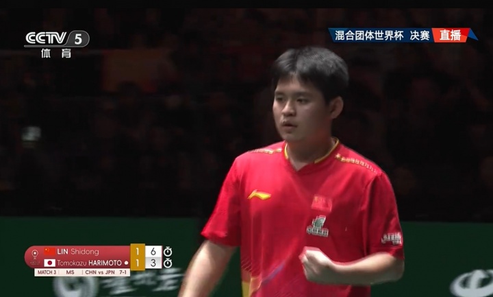 第三盘男单,林诗栋2-1张本智和(6-11、11-5、11-6)