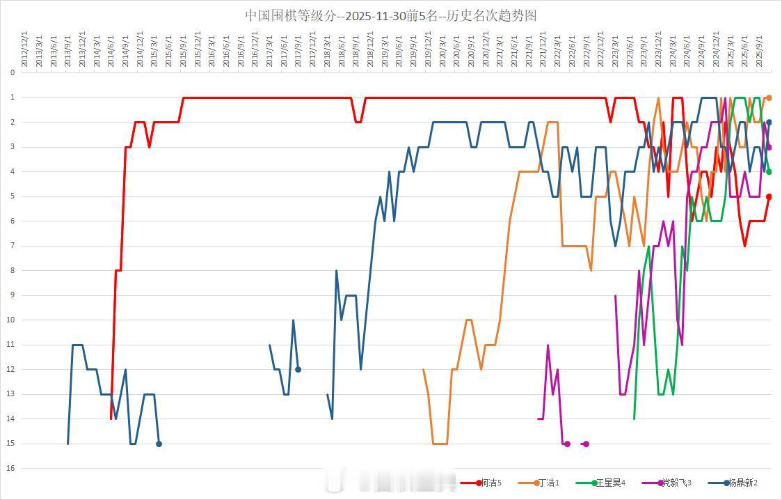 中国围棋等级分Top15(截止2025-11-30)围棋 丁浩连续2次、最长连