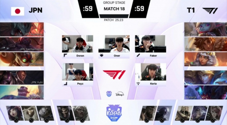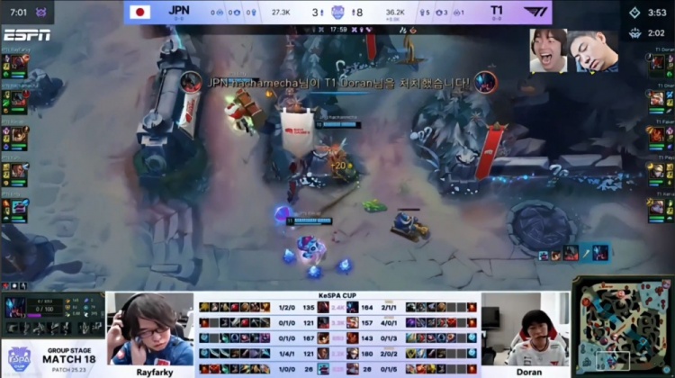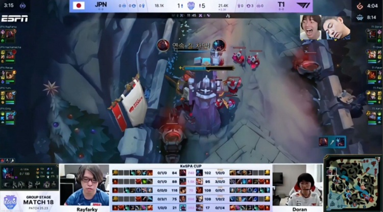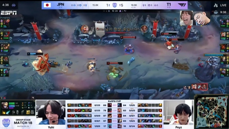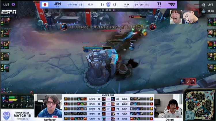 [23:21]上路团战,Keria波比锤飞JPN两人,Yuhi卢锡安穿兵Q带走Oner奇亚娜,hachamecha剑魔砍掉Peyz,JPN打出1换3,经济落后9k。