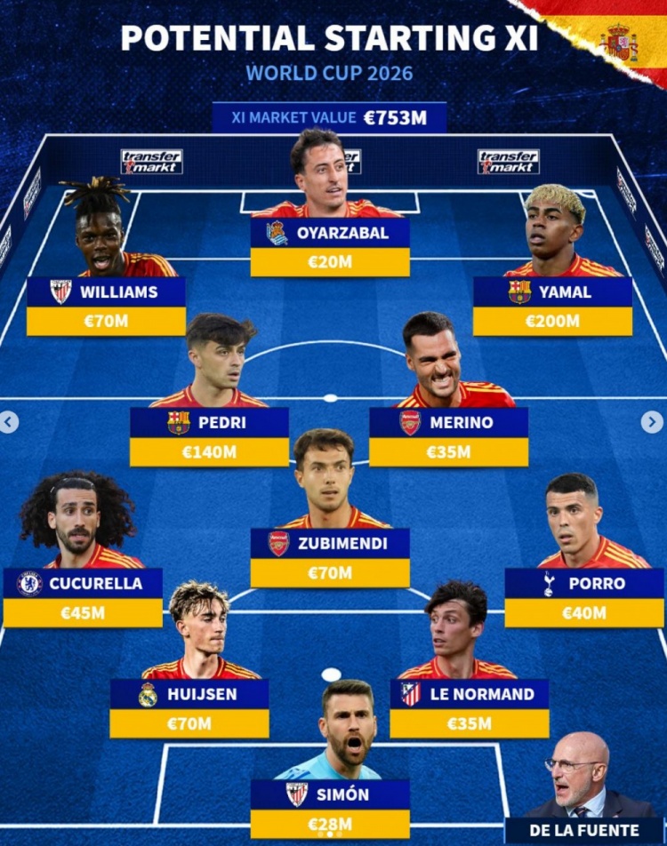 前锋:尼科·威廉姆斯(毕尔巴鄂竞技)、奥亚萨瓦尔(皇家社会)、亚马尔(巴萨)