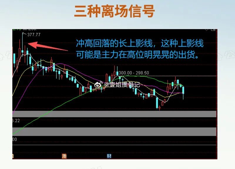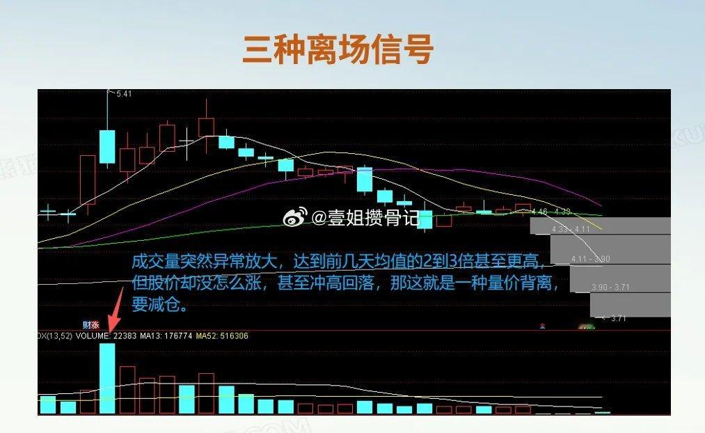 炒股啊,会买是徒弟,会卖才是师傅,赚钱了要懂得落袋为安。不然,盈利归零,甚至被套,这些事情经常发生。今天给大家分享一个三个信号共振离场的方法,非常的简单实用,分别对应K线、筹码和量能,记住这三个信号,一般只要同时出现两个以上,那你就可以考虑及时离场了,值得收藏!1. K线。当K线出现第一个大幅回撤,但还有盈利的时候,就要考虑及时离场。其次是K线走的比较难看的,最典型的当然是冲高回落的长上影线,这种上影线可能是主力在高位明晃晃的出货,还是要注意及时的规避风险。2. 筹码峰。很多人看K线经常忽略筹码,但这其实也是判断主力是否离场的信号,如果股价在起涨阶段的筹码峰没有松动,那就可以认为主力还在。如果这部分的筹码消失,那就可以认为前期的主力也已经跑路了。3. 成交量。如果成交量突然异常放大,达到前几天均值的2到3倍甚至更高,但股价却没怎么涨,甚至冲高回落,那这就是一种量价背离,或者股价创出新高,但量能却没有跟随创出新高,这也是一种量价背离,它们的本质都是主力用量能或者价格来制造假象,但实际上却是边拉边卖,吸引散户进场。