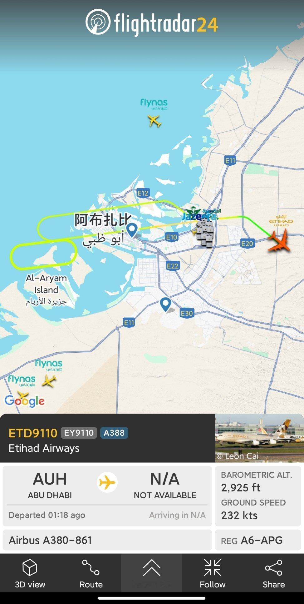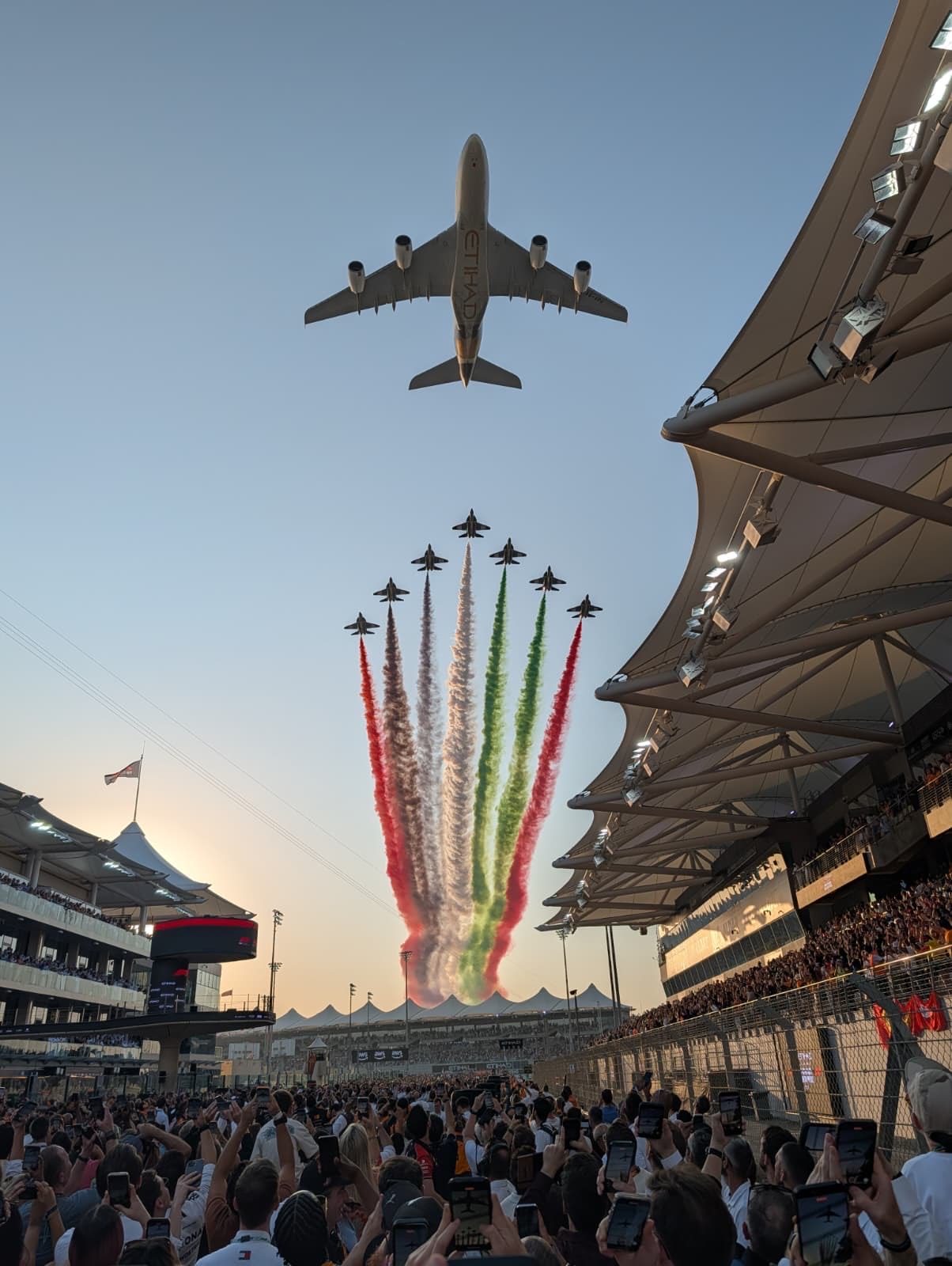 阿联酋阿提哈德航空的空客A380和阿联酋🇦🇪空军“骑士”飞行表演队(换装🇨🇳国产的L-15A高级教练机)编队低空飞跃 F1阿布扎比🇦🇪大奖赛正赛~亚斯湾码头赛道上空🛫F1赛车2025F1阿布扎比大奖赛