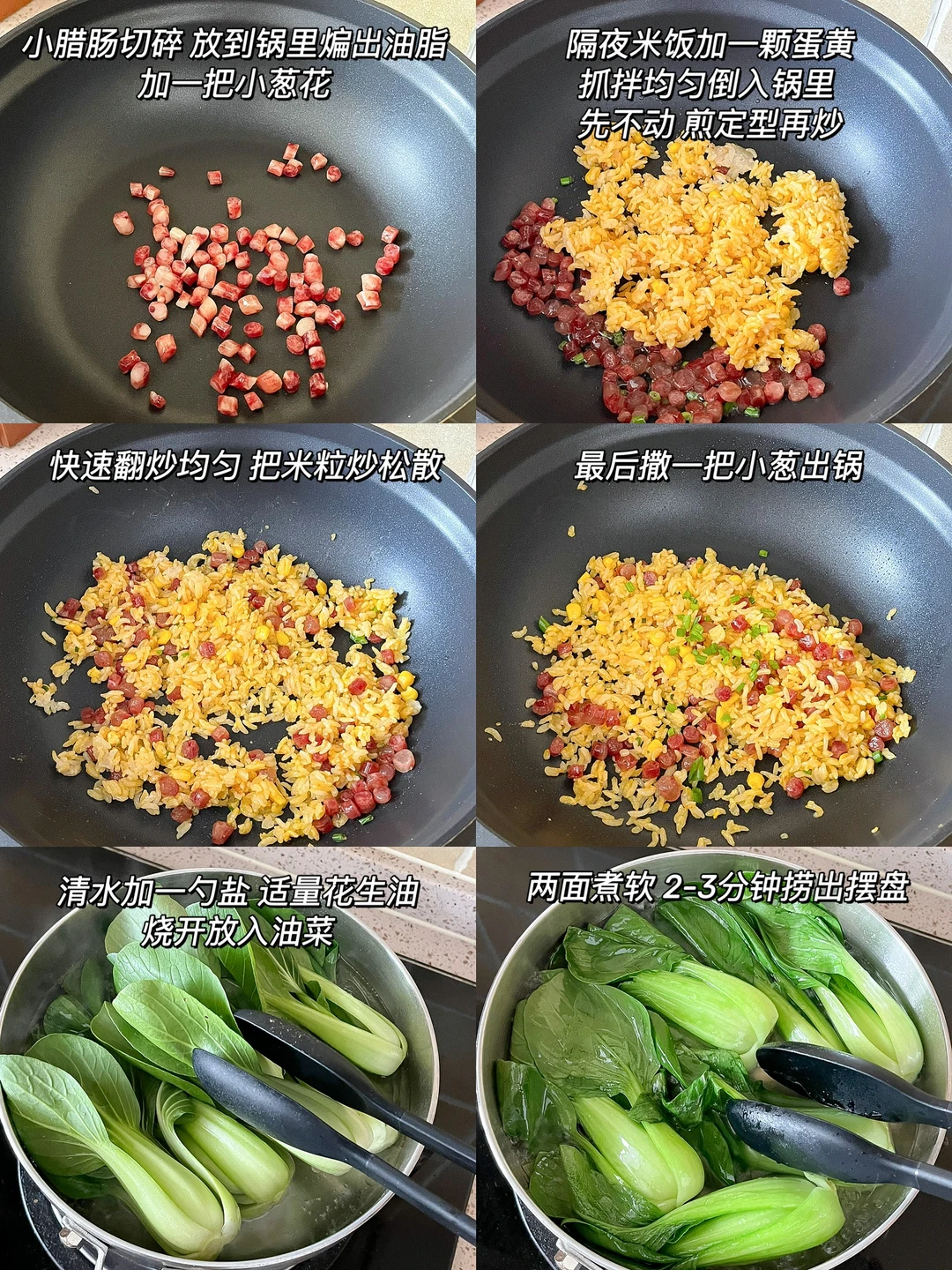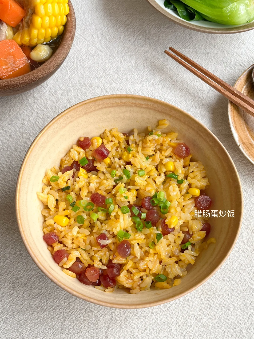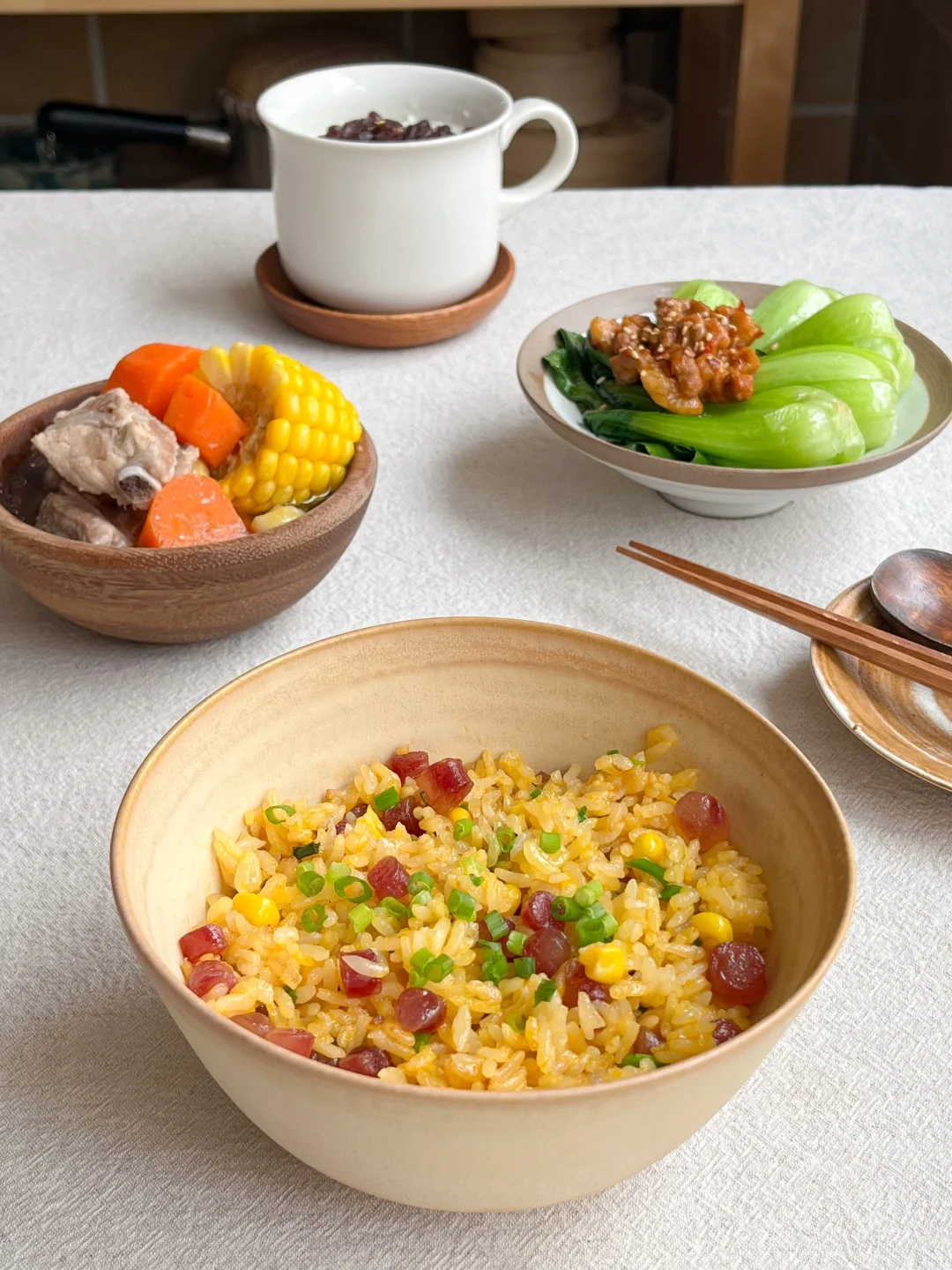 今天的饭: 腊肠蛋炒饭🥓 盐水油菜🥬 玉米白果排骨汤🌽 红豆双皮奶🫘 蒸一次的红豆双皮奶🫘 双皮奶在家就能做 只需要牛奶 白糖 鸡蛋 上面小料就随便放了 我喜欢蜜豆和蓝莓 一般是要蒸两次 今天偷懒打好的蛋清+牛奶 直接蒸15分钟 关火焖10分钟 放冰箱2小时 粒粒分明的腊肠蛋炒饭🥓 吃火锅如果剩了小腊肠 试试用它做蛋炒饭 剩的那颗蛋黄和隔夜米饭拌匀 能炒出黄金米饭 把小腊肠的油脂煸出来 放米饭先别动 煎定型 再快速炒散 撒一把灵魂小葱花 香死了~