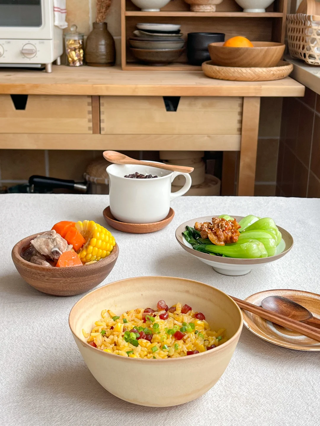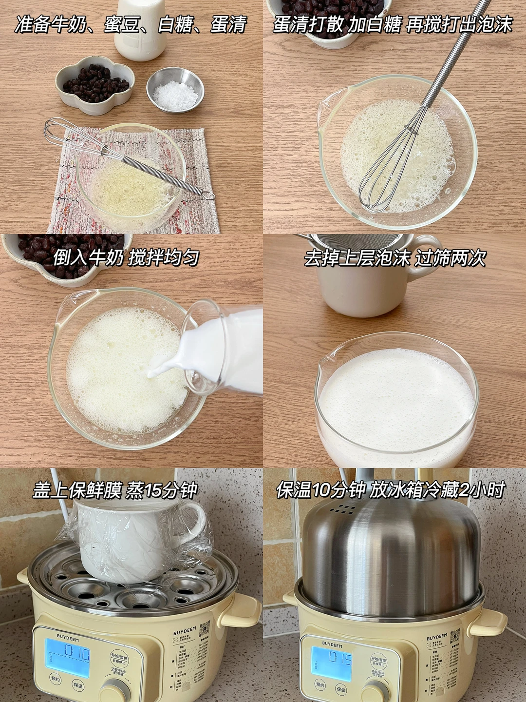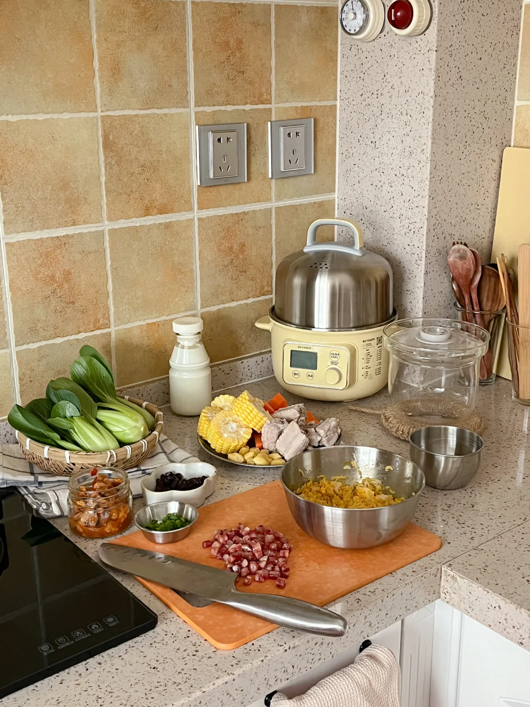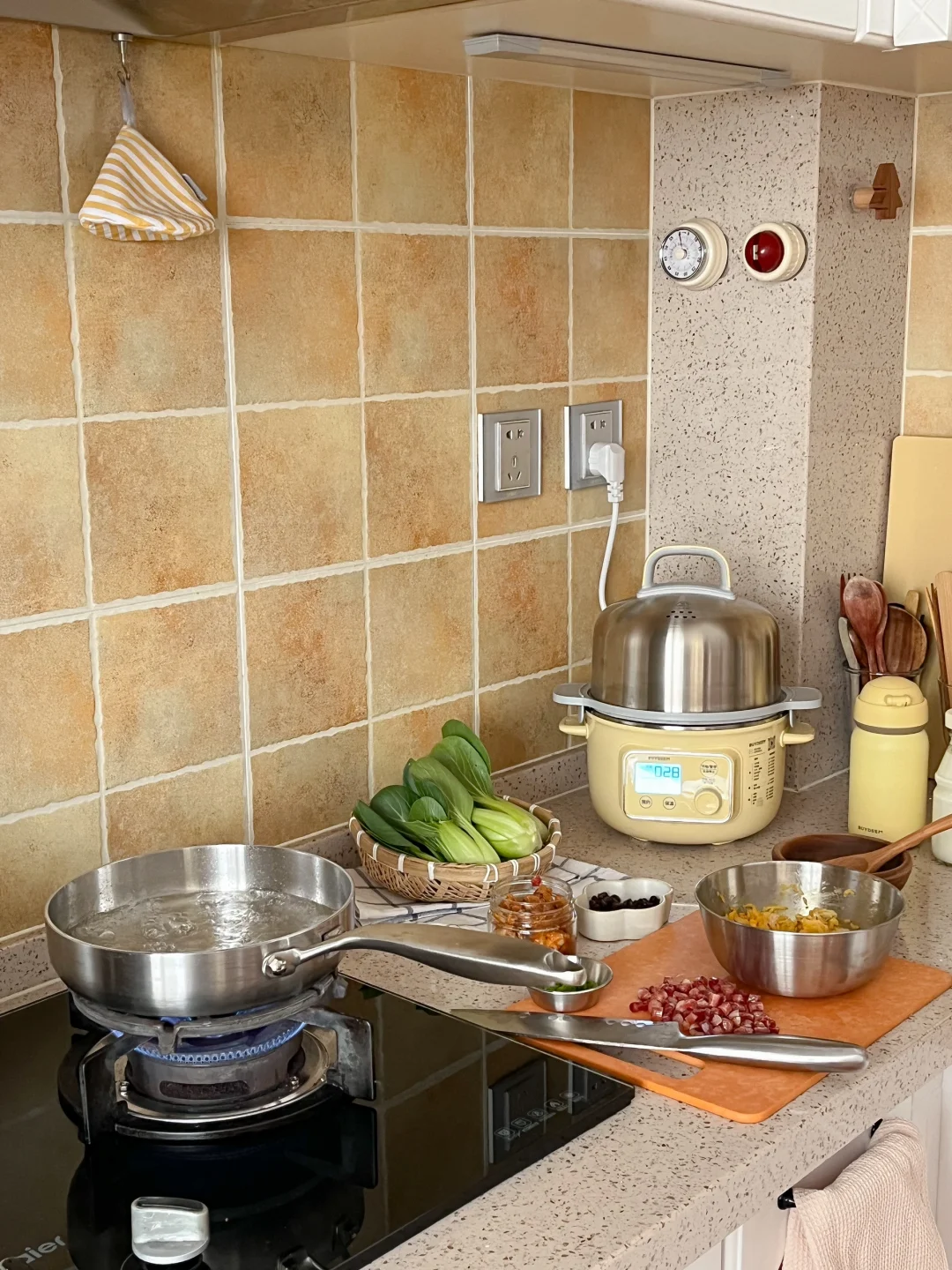 今天的饭: 腊肠蛋炒饭🥓 盐水油菜🥬 玉米白果排骨汤🌽 红豆双皮奶🫘 蒸一次的红豆双皮奶🫘 双皮奶在家就能做 只需要牛奶 白糖 鸡蛋 上面小料就随便放了 我喜欢蜜豆和蓝莓 一般是要蒸两次 今天偷懒打好的蛋清+牛奶 直接蒸15分钟 关火焖10分钟 放冰箱2小时 粒粒分明的腊肠蛋炒饭🥓 吃火锅如果剩了小腊肠 试试用它做蛋炒饭 剩的那颗蛋黄和隔夜米饭拌匀 能炒出黄金米饭 把小腊肠的油脂煸出来 放米饭先别动 煎定型 再快速炒散 撒一把灵魂小葱花 香死了~