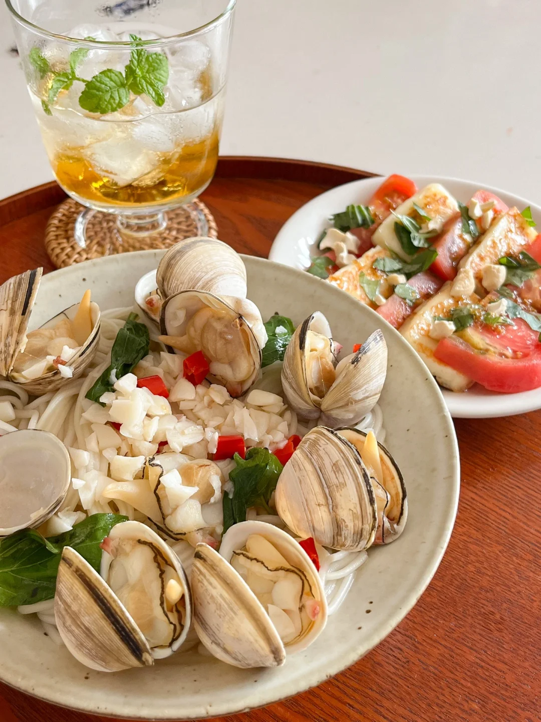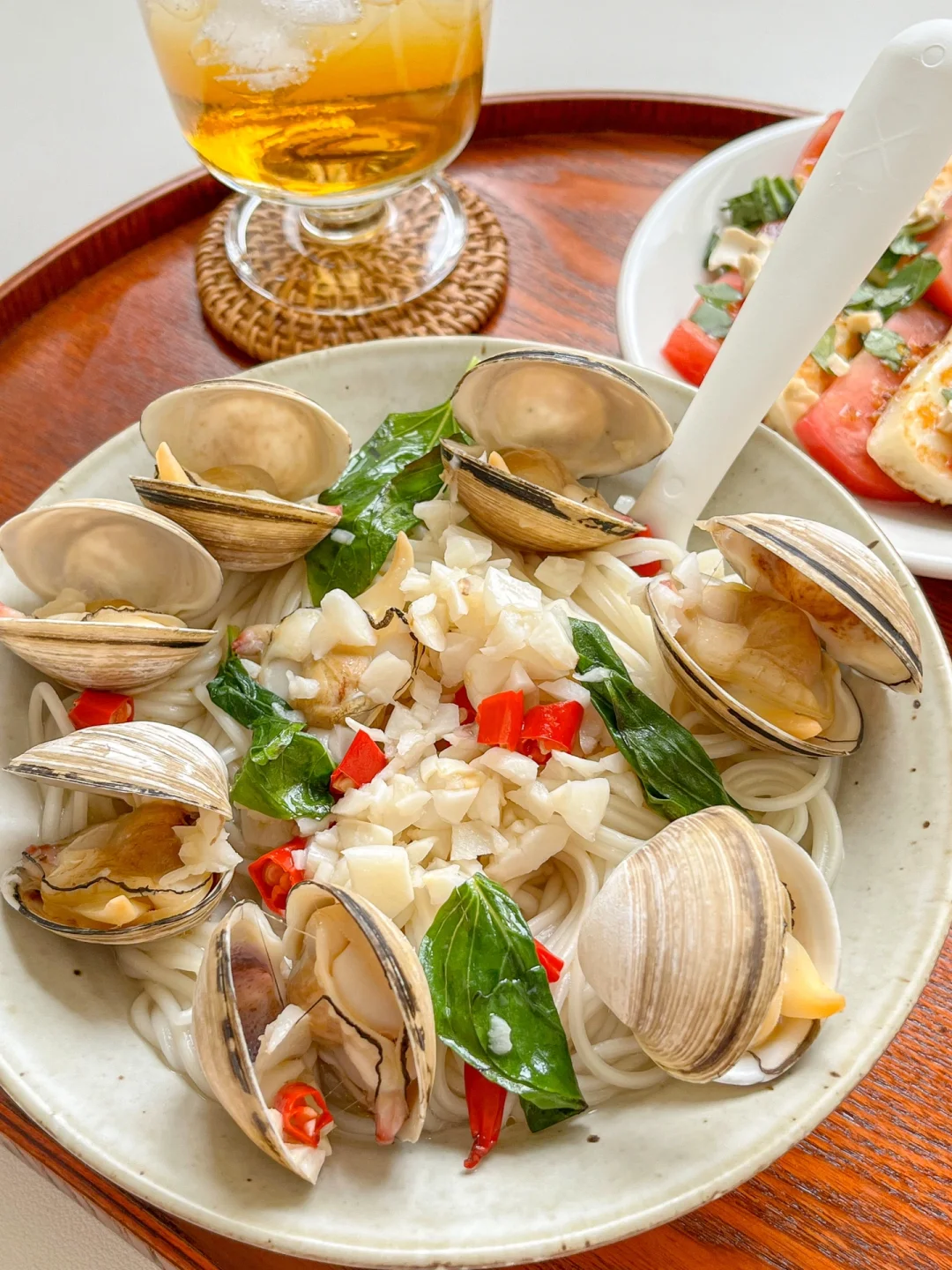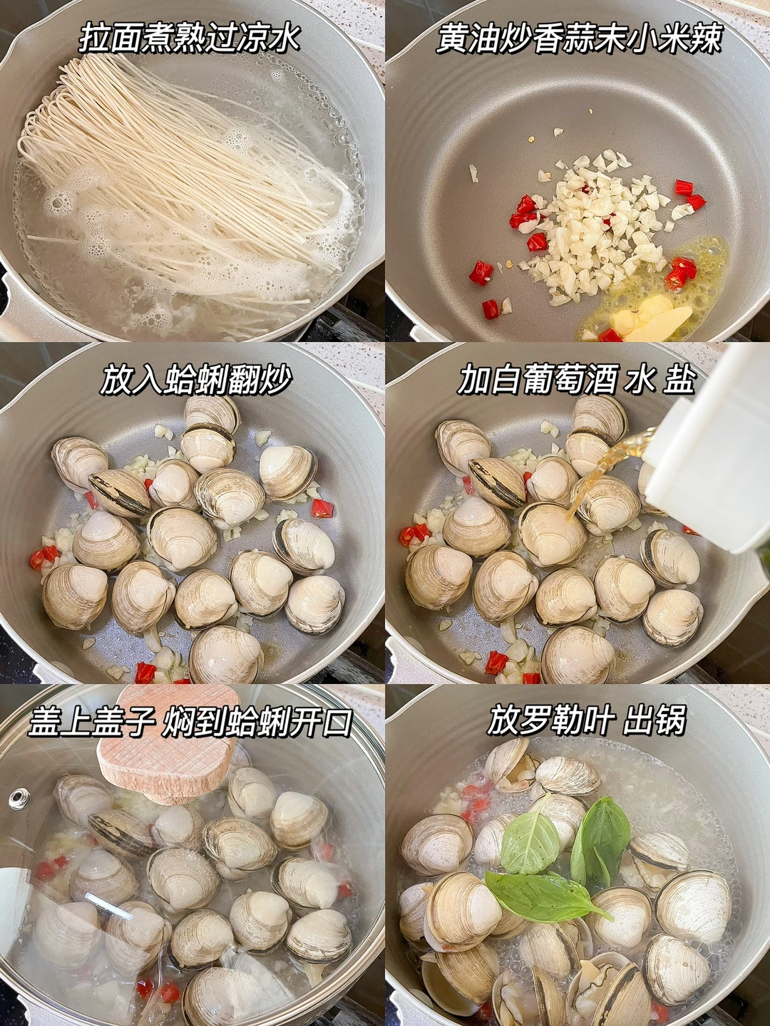 贝壳类食材做起来比肉类更简单方便,热量低还是优质蛋白。蒜和白葡萄酒特别适合贝壳类,再加一点甜罗勒叶,可以激发出蛤蜊的鲜美~汤底真的鲜掉眉毛啦!全喝光光