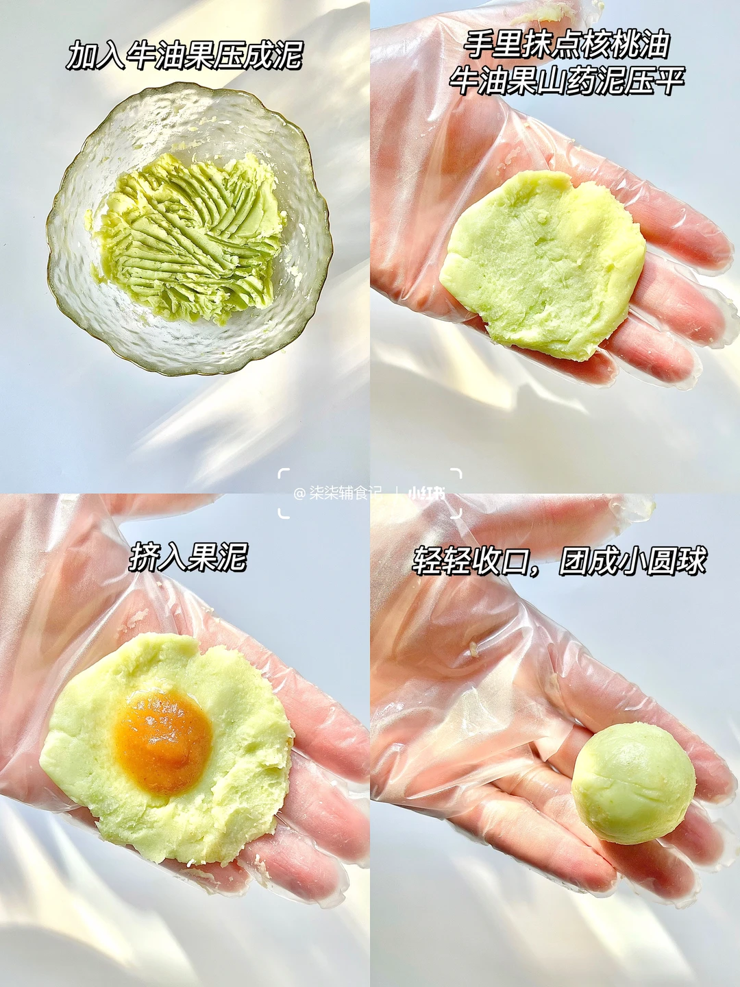 ▫️手里刷点核桃油防粘,牛油果山药泥压平,挤入果泥。