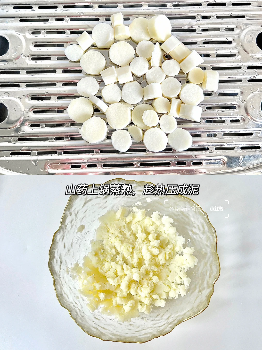 ▫️山药去皮切成小块,上锅蒸熟,趁热压成泥