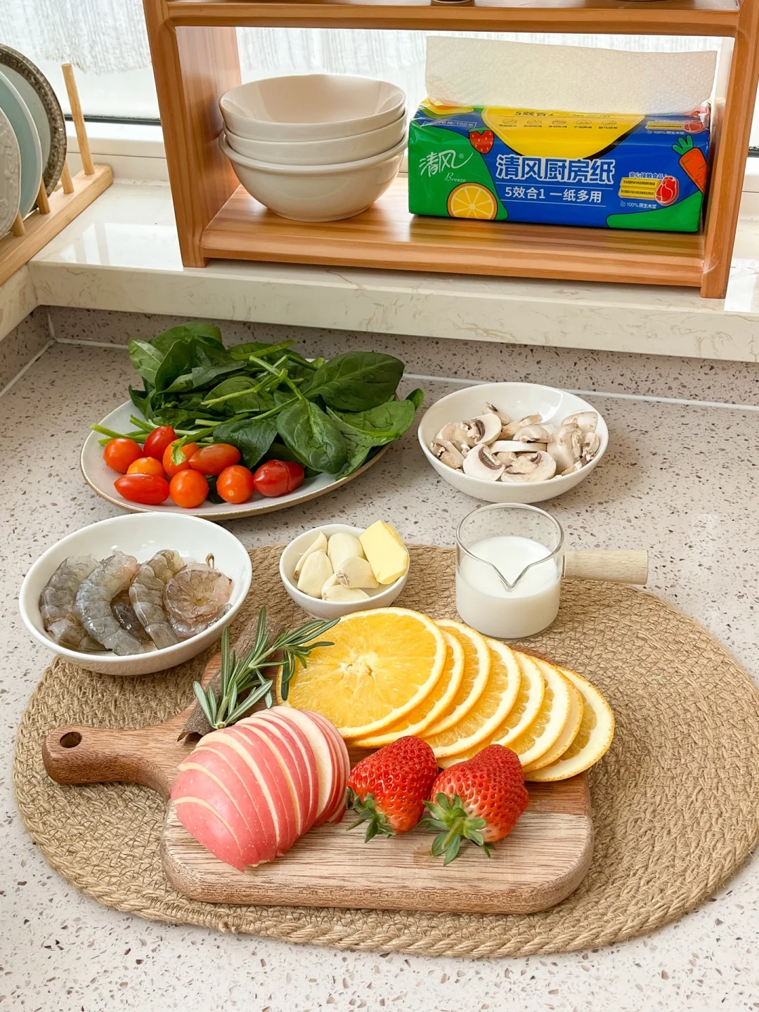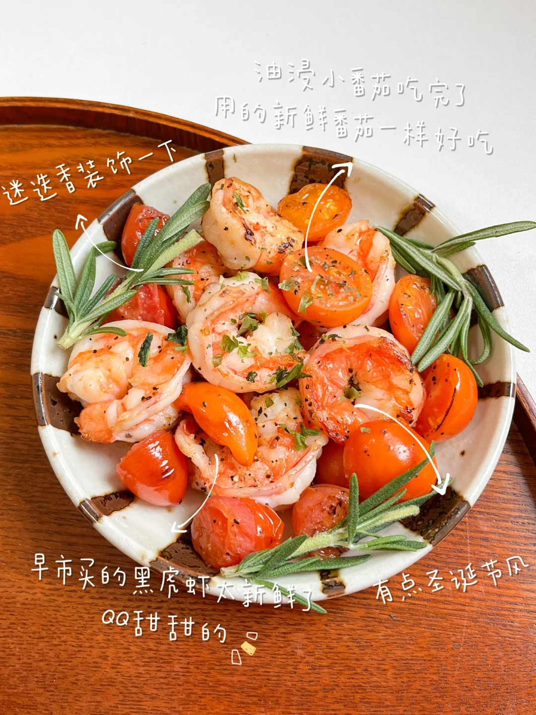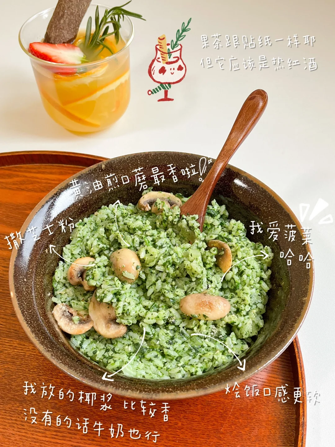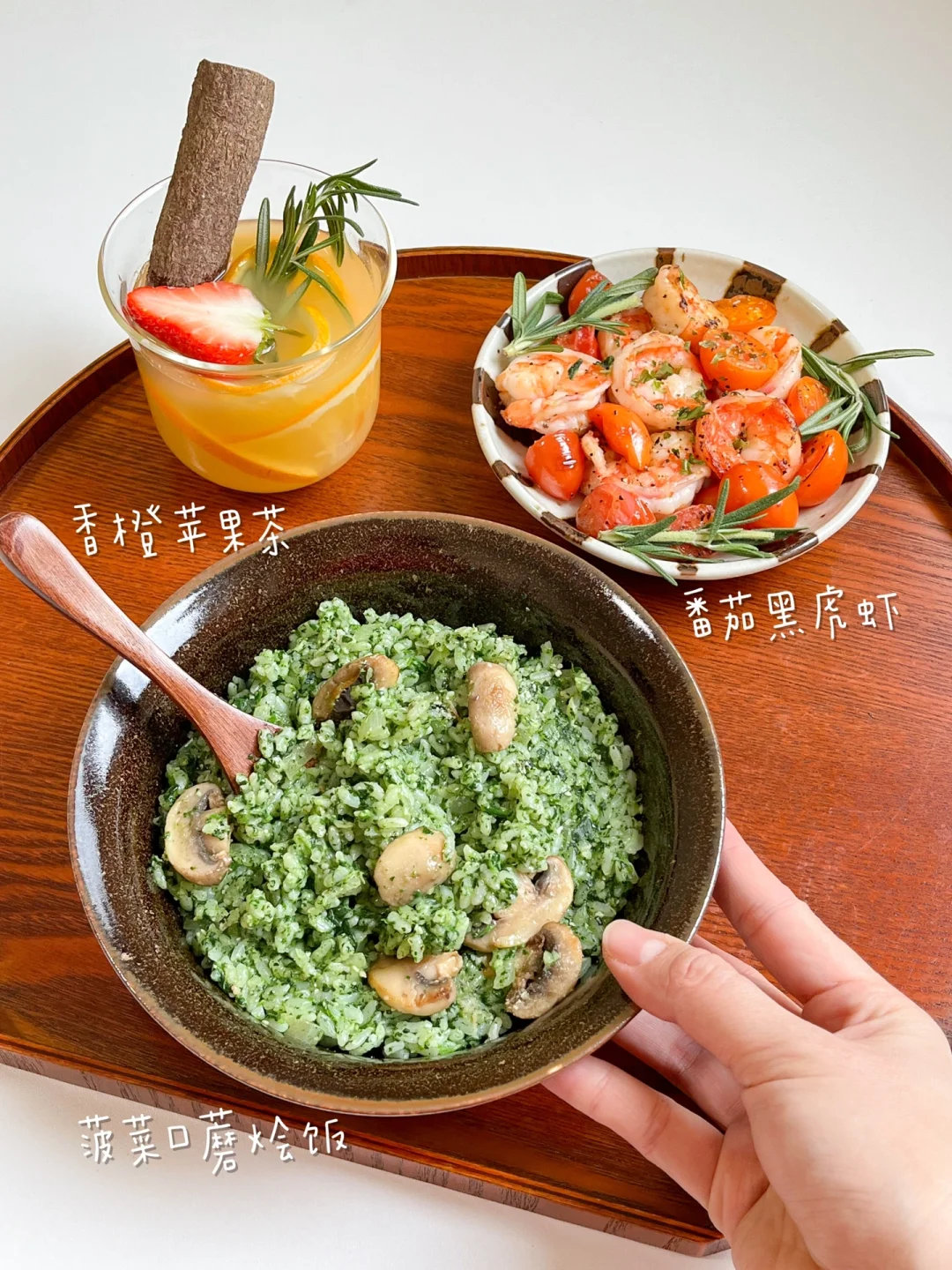 “说到圣诞节,我一下子就想到了红色和绿色这个颜色CP,今天是我的宅家圣诞风🎄午餐 ,绿绿的菠菜烩饭配上红色的番茄黑虎虾,再来上一杯暖暖的橙子苹果茶,也给自己一份小小的仪式感~”