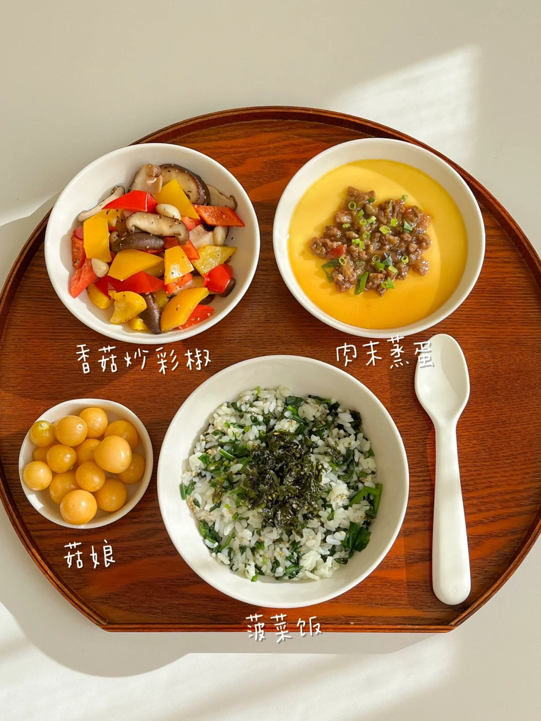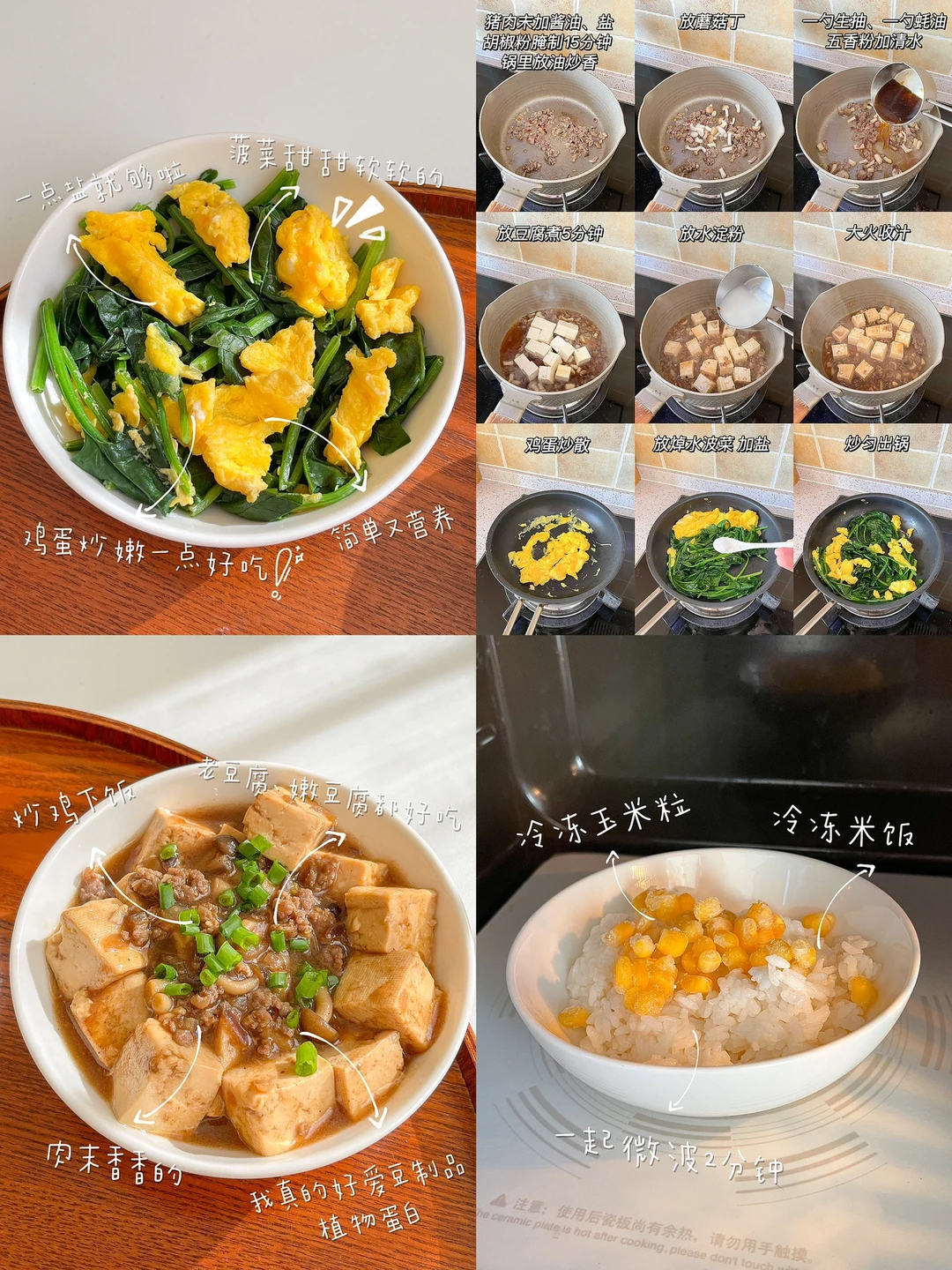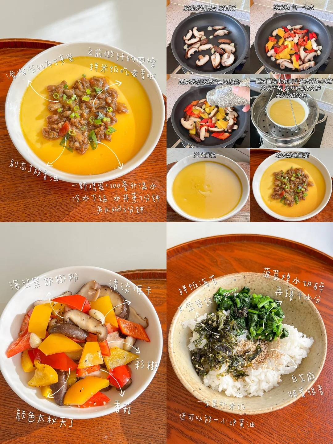 “一个人吃饭,可以吃的少,但也要吃得好!” 整理了一下最近吃的午餐 好吃营养又健康哦~ 做法都在图上 🟢彩椒炒香菇+肉末蒸蛋+菠菜饭 🔴菠菜炒鸡蛋+肉末豆腐+玉米饭 🟠西葫芦炒蛋+彩椒鸡丁+豆芽饭 🟡白菜炒豆泡+肉酱菠菜+玉米饭