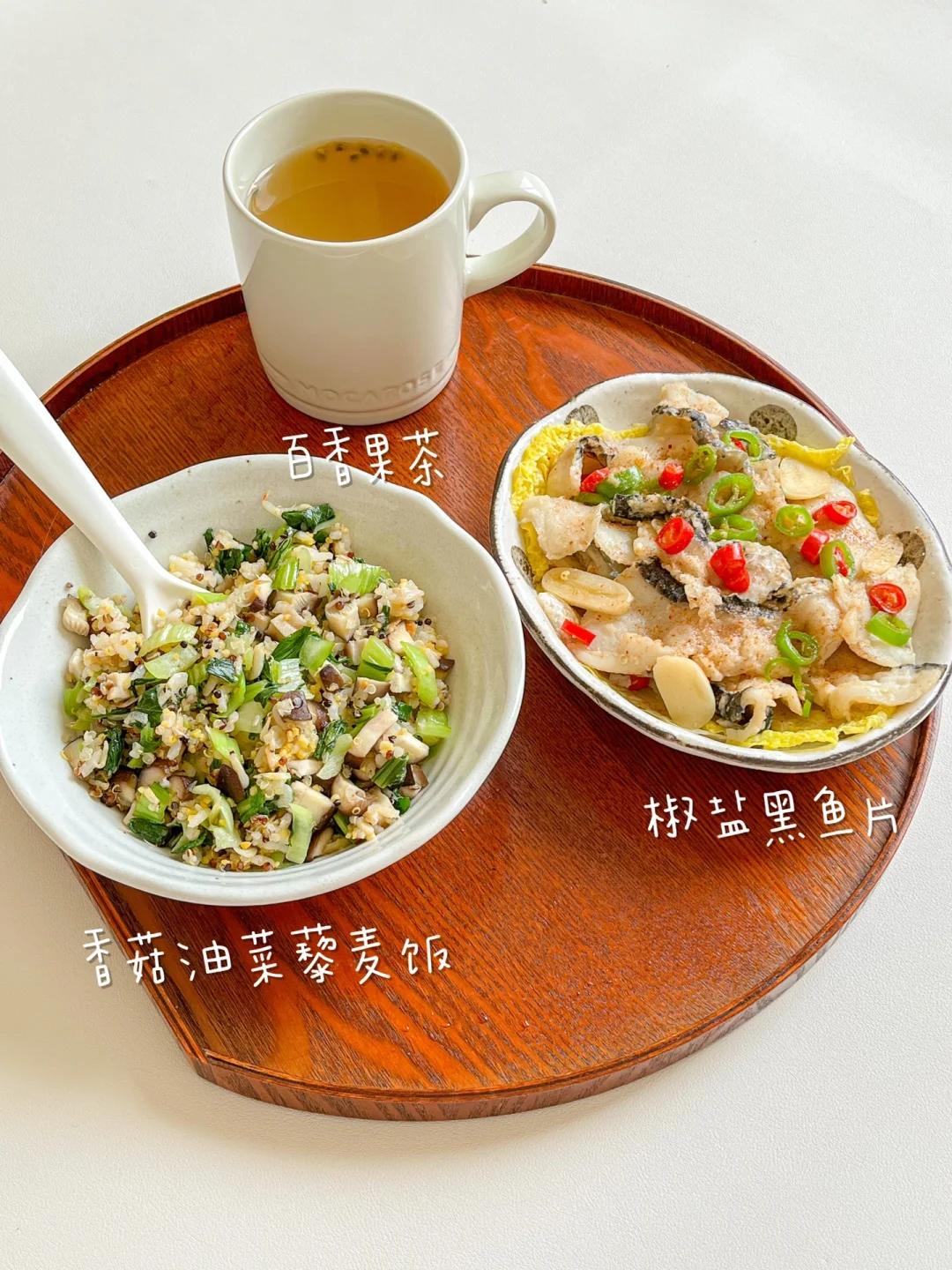 “现代人的很多病症都是吃出来的,尤其是三高,只需要四个字就能改善:粗茶淡饭!” 今日午餐: ¹香菇油菜藜麦饭 ²椒盐黑鱼片 ³百香果茶 🟢香菇油菜藜麦饭 香菇油菜是最家常的小炒,跟藜麦饭一起吃好香。炒出来味道清新,香菇鲜嫩,还放了虾皮一起炒,健康和美味一锅出~ 🟤椒盐黑鱼片 平时吃火锅经常涮的黑鱼片,做成葱油和椒盐味的都好吃。我买的是挂好浆的鱼片,简单的焯个水,水开煮1分钟就好,别煮老了。 再炒个蒜蓉辣椒酱,放上鱼片轻轻翻炒,撒上椒盐就好了