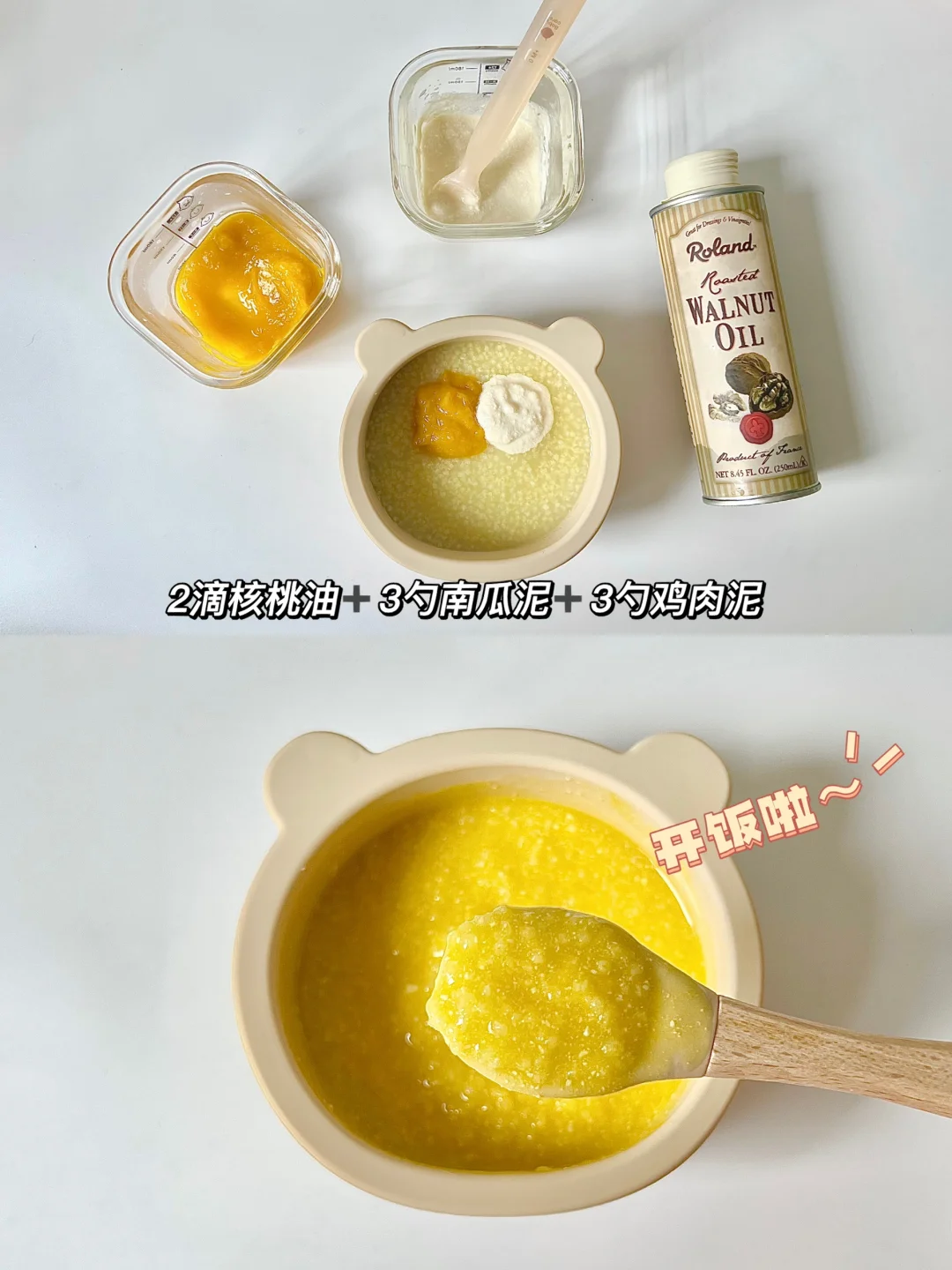 👧:7个月➕17天 🥣:胚芽米➕核桃油➕南瓜➕鸡胸肉 ⏰:上午11:30 📝:10g胚芽米➕100ml水➕2滴核桃油➕3勺南瓜泥➕3勺鸡胸肉泥 🍽️:下午加餐:樱桃🍒 吃鸡肉泥的第三天~搭配南瓜小米煮十倍粥,香甜可口,姐妹们快来get![斜眼R][斜眼R][斜眼R] 🥣柒柒全部都吃完啦,饭后喝了40ml水,现在柒柒吃完10g胚芽米可以隔3个小时才喝奶,暂时不会给她加量,有时候她都吃不完,再吃一段时间看看吧~下次加量估计就可以顶一顿奶量了哈哈…[派对R][派对R][派对R]