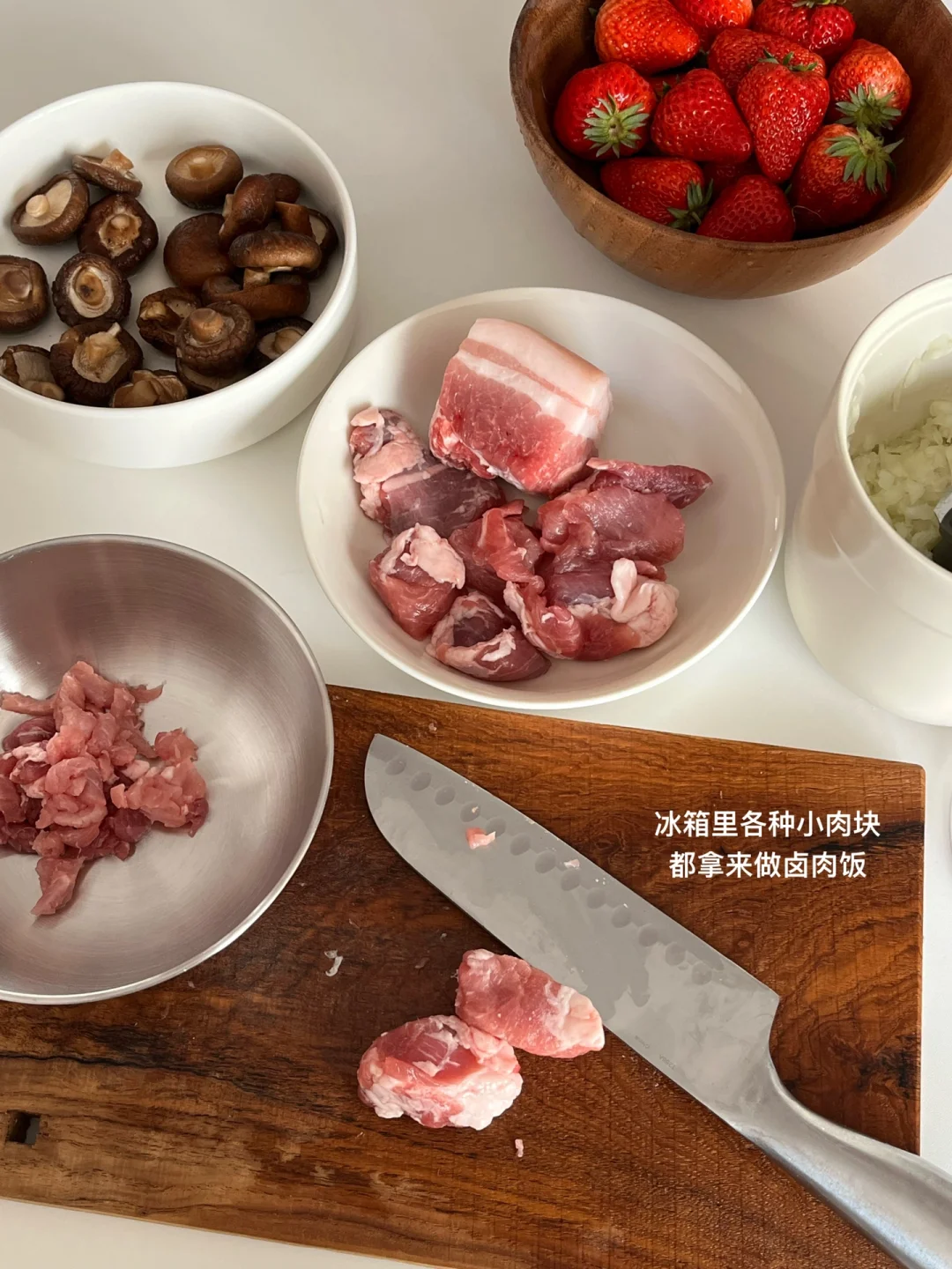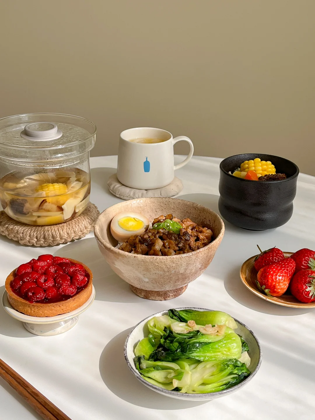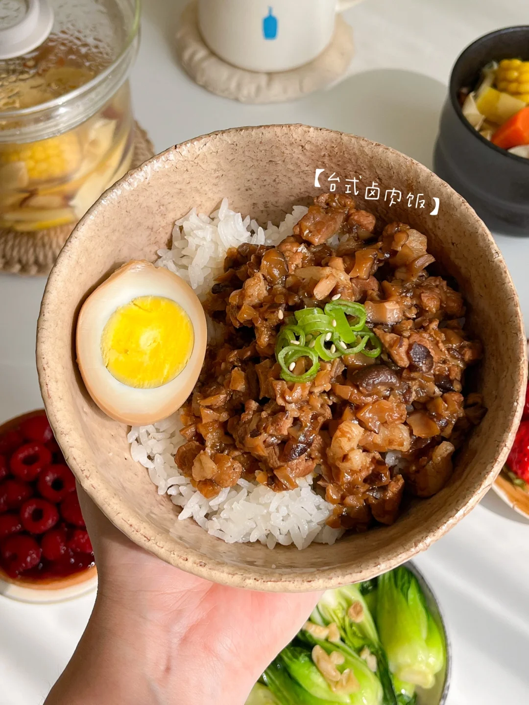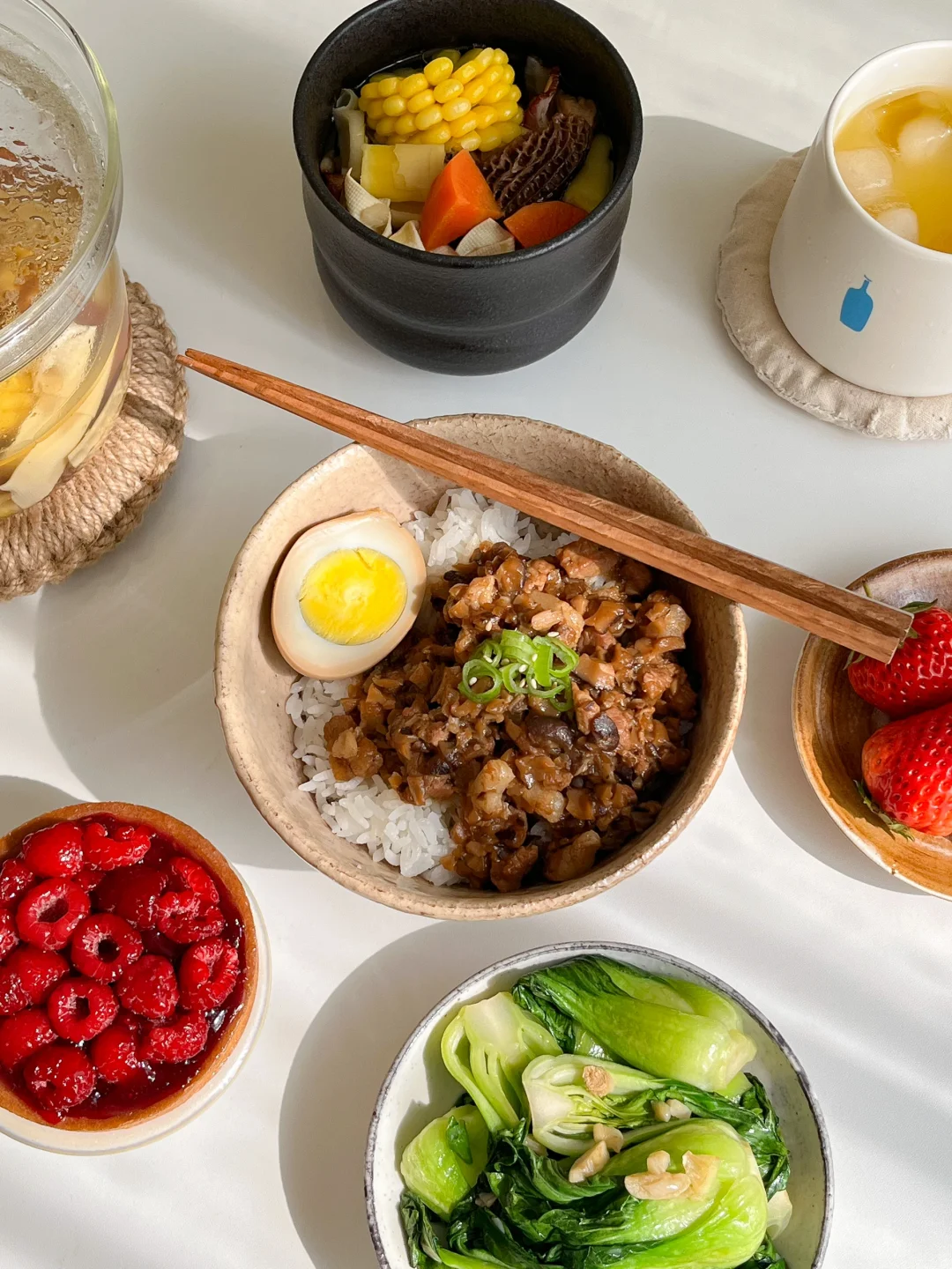 今天的饭: 台式卤肉饭🍖 覆盆子挞🍒 蒜炒上海青 腌笃鲜🎍 冰橙汁🧃草莓🍓 腌笃鲜🎍 趁着春天笋最嫩的时候来一碗腌笃鲜吧 简单的隔水炖味道也不错 鲜掉眉毛啦 喝一口汤 一口笋 一口玉米… 配上自己做的卤肉饭 就一个字 香! 台式卤肉饭🍖 卤肉炖得软软糯糯 肥而不腻 入口即化~ 一般用带皮的五花肉 我把家里库存肉都清空了 用炒出的猪油炸洋葱和香菇丁 再放黄酒/米酒 出香味再放酱油和黄冰糖 小火咕嘟1个小时 记得多留点汤汁 浓郁的酱汁裹着每一粒米饭 一口下去 什么疲惫都不见了[派对R][派对R]