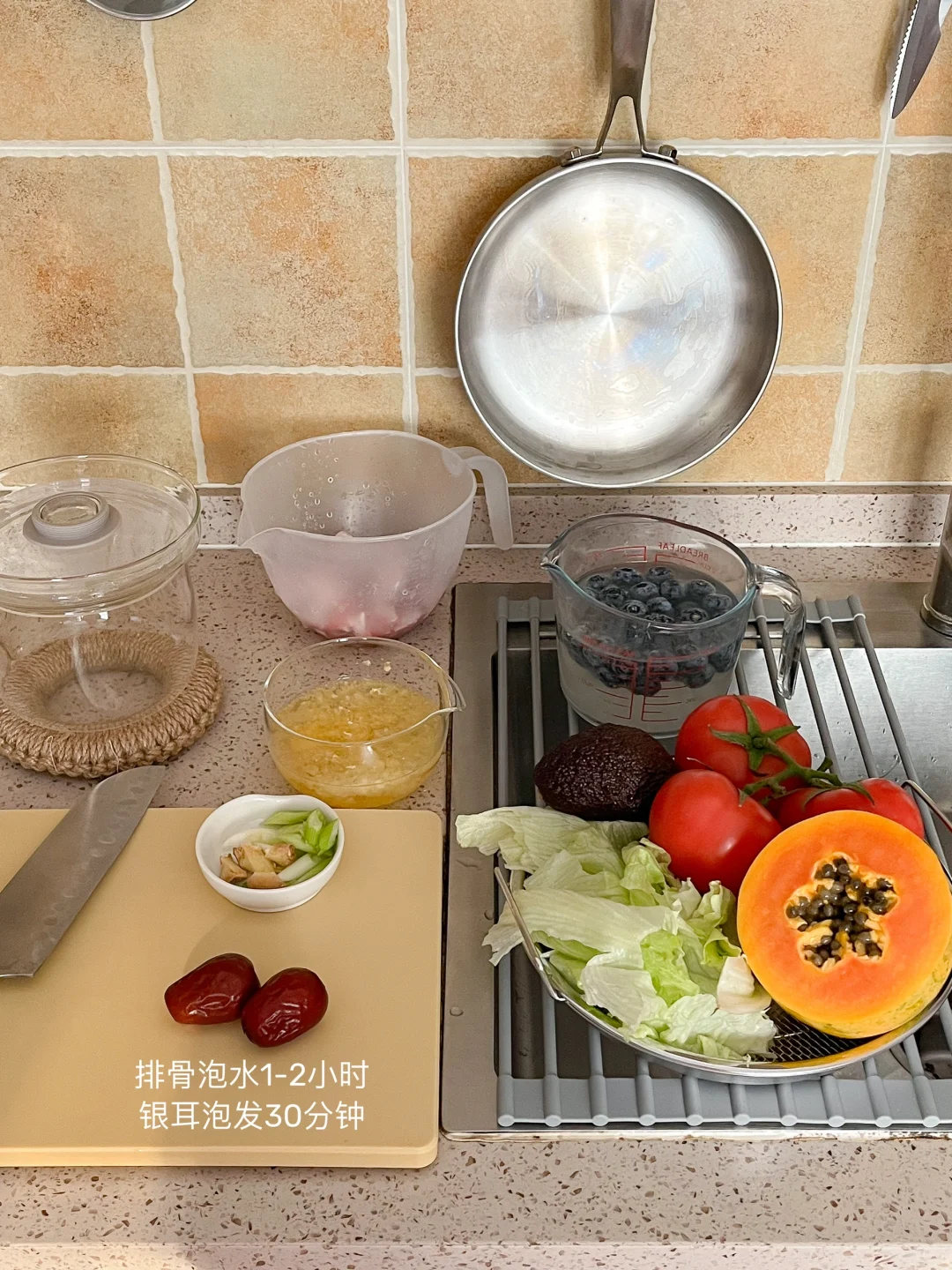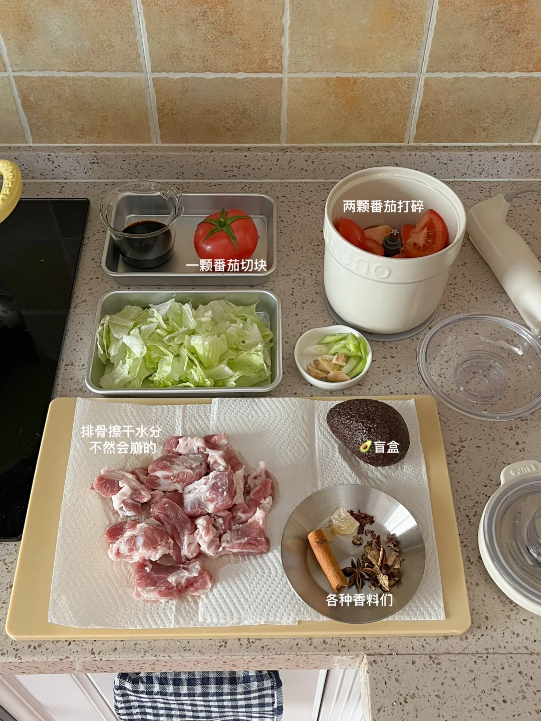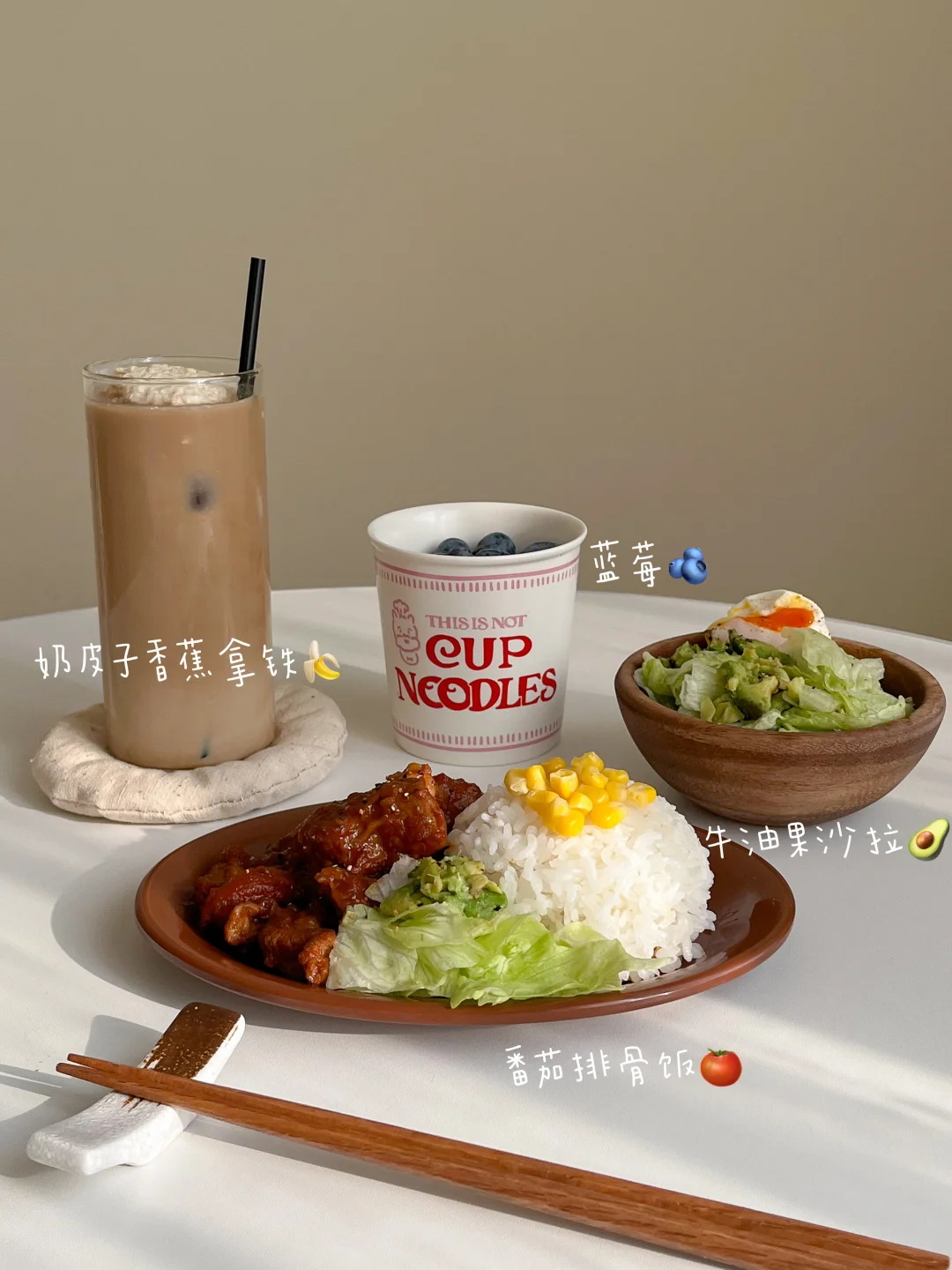 今天的饭: 番茄排骨饭🍅 牛油果生菜沙拉🥑 炖牛乳木瓜银耳🍯 奶皮子香蕉拿铁🍌 蓝莓🫐 番茄排骨🍅 这次用的两小条猪软肋骨 只有脆骨很好煮烂 三颗番茄 一颗切块 两颗打碎煮汤用 不想打碎就去皮切小块 把番茄融入到肉汤 汤汁才会酸甜浓郁 多留点汤拌饭哟 奶皮子香蕉拿铁🍌 香蕉牛奶+浓缩+奶皮子=快乐 奶皮子口空吃了半盒 然后就..腻住了 炖牛乳木瓜银耳🍯 冬天女孩子就得喝点润润的小炖品 用电炖盅还是挺方便的 也不怕煮干锅啦 把木瓜、银耳、大枣 一起放进去 少加一点水 吃的时候再放牛奶或椰奶🥛