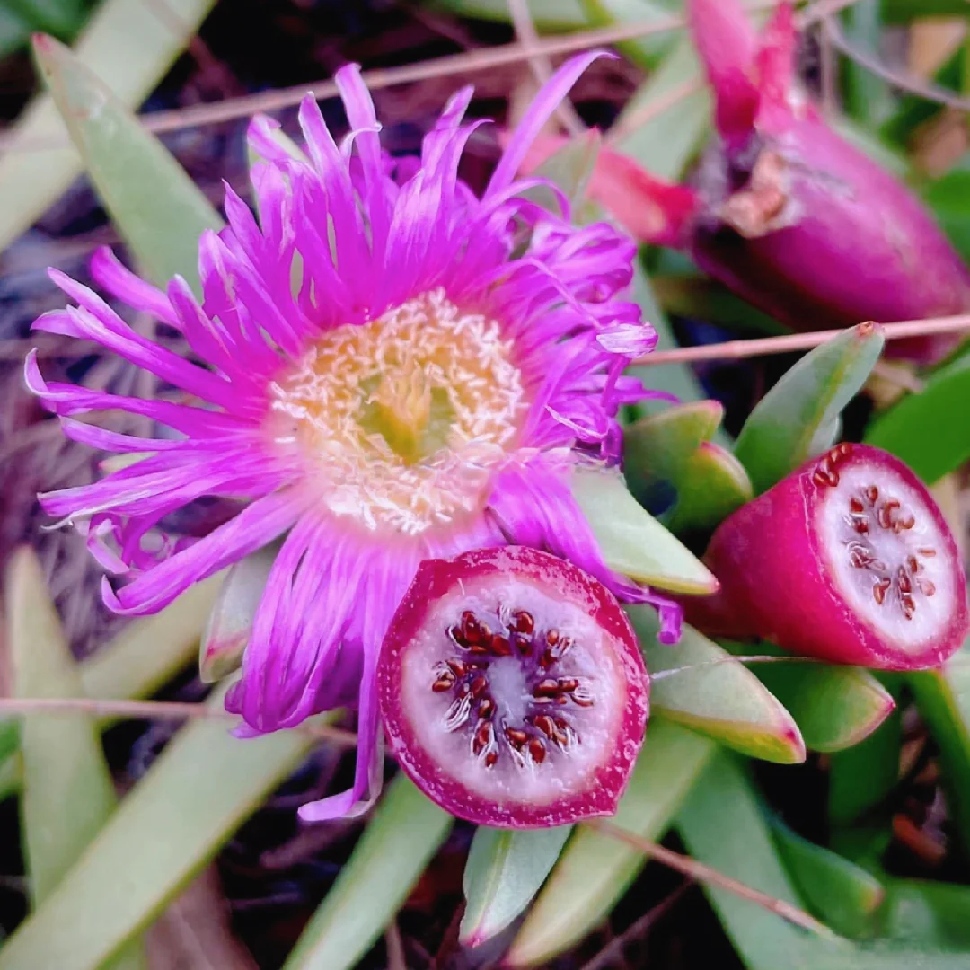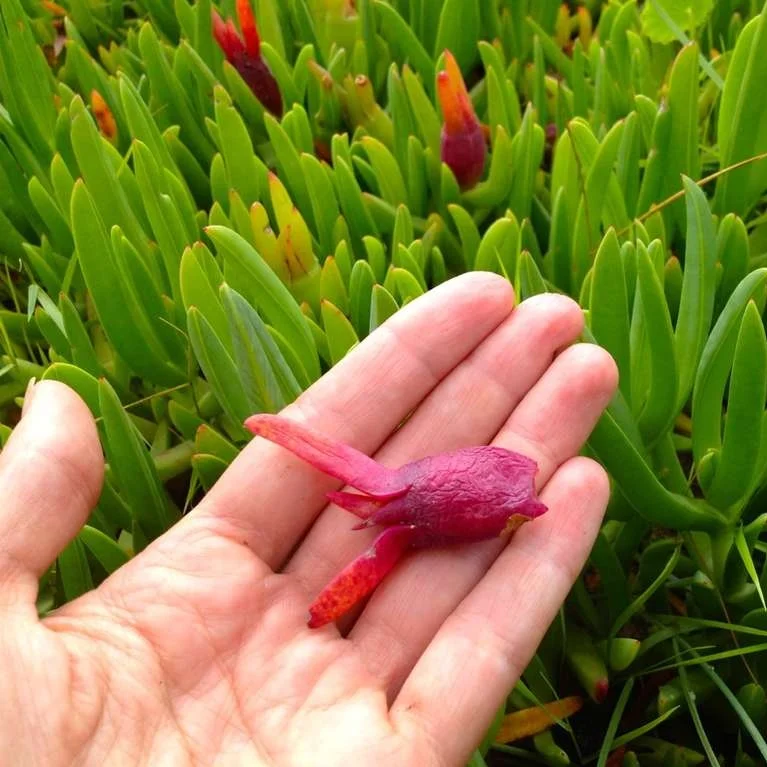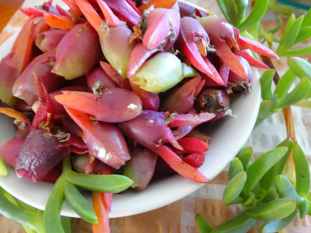 猪脸 Carpobrotus glaucescens 这种植物的每一部分都是可食用和/或药用的﹣﹣叶子可以像芦荟一样用来减少皮肤的刺痛和烧伤,也可以生吃或煮熟。 白人定居者用这种水果做果酱和果冻,用叶子做蔬菜。 澳洲海边小孩从小吃到大的零食水果。它们的味道介于猕猴桃和草莓之间,加上一点无花果味,再加上一点盐。