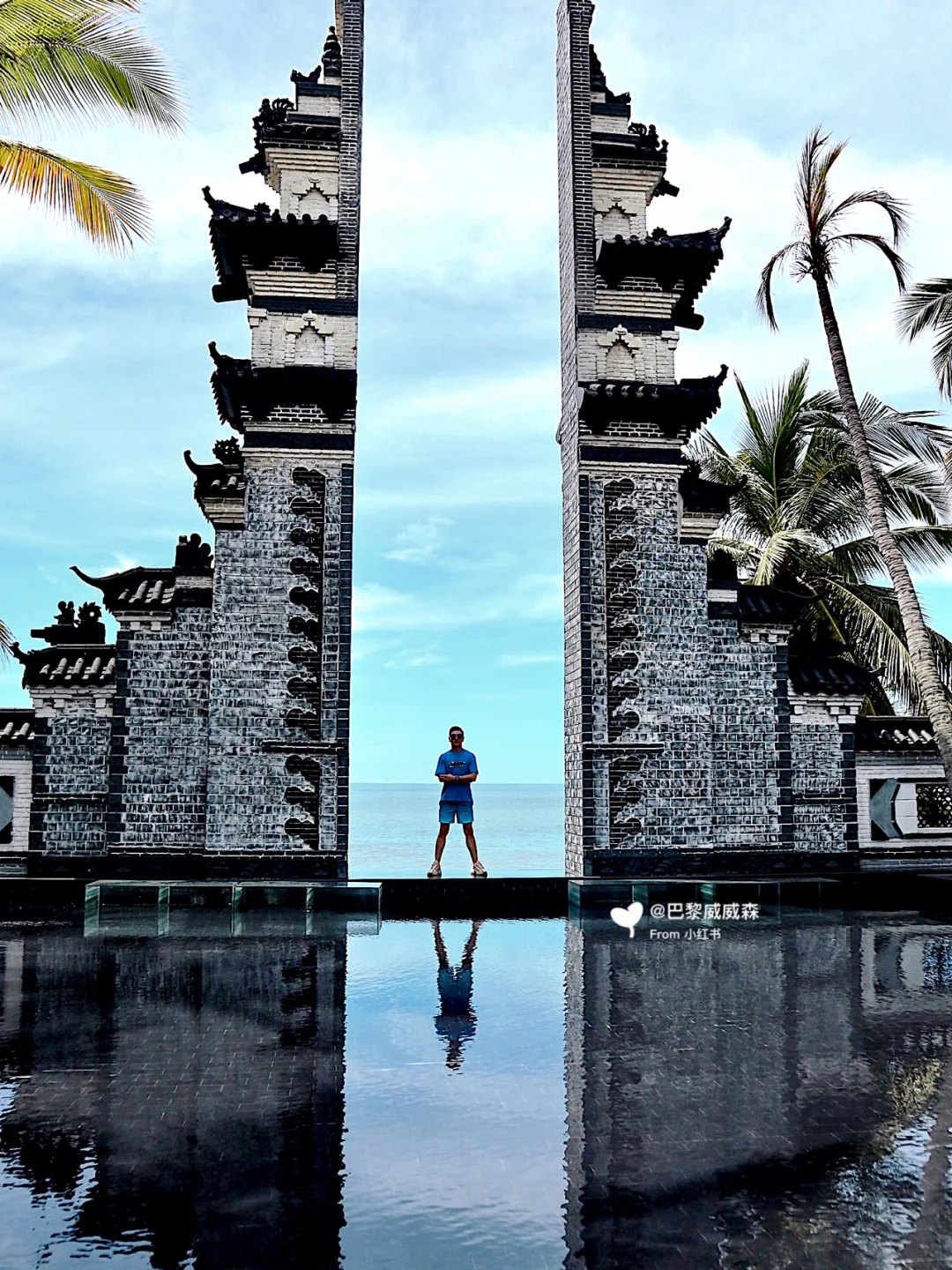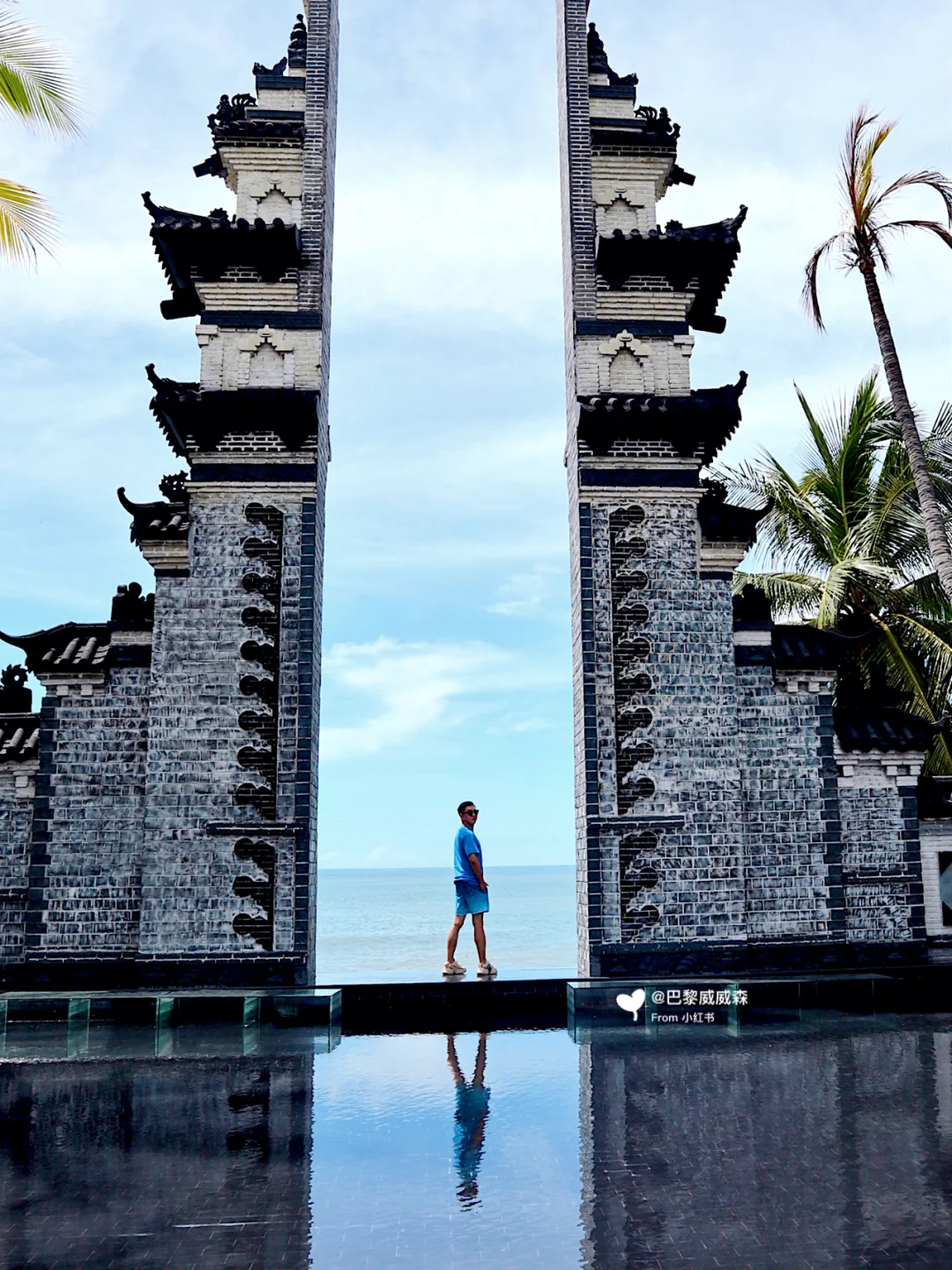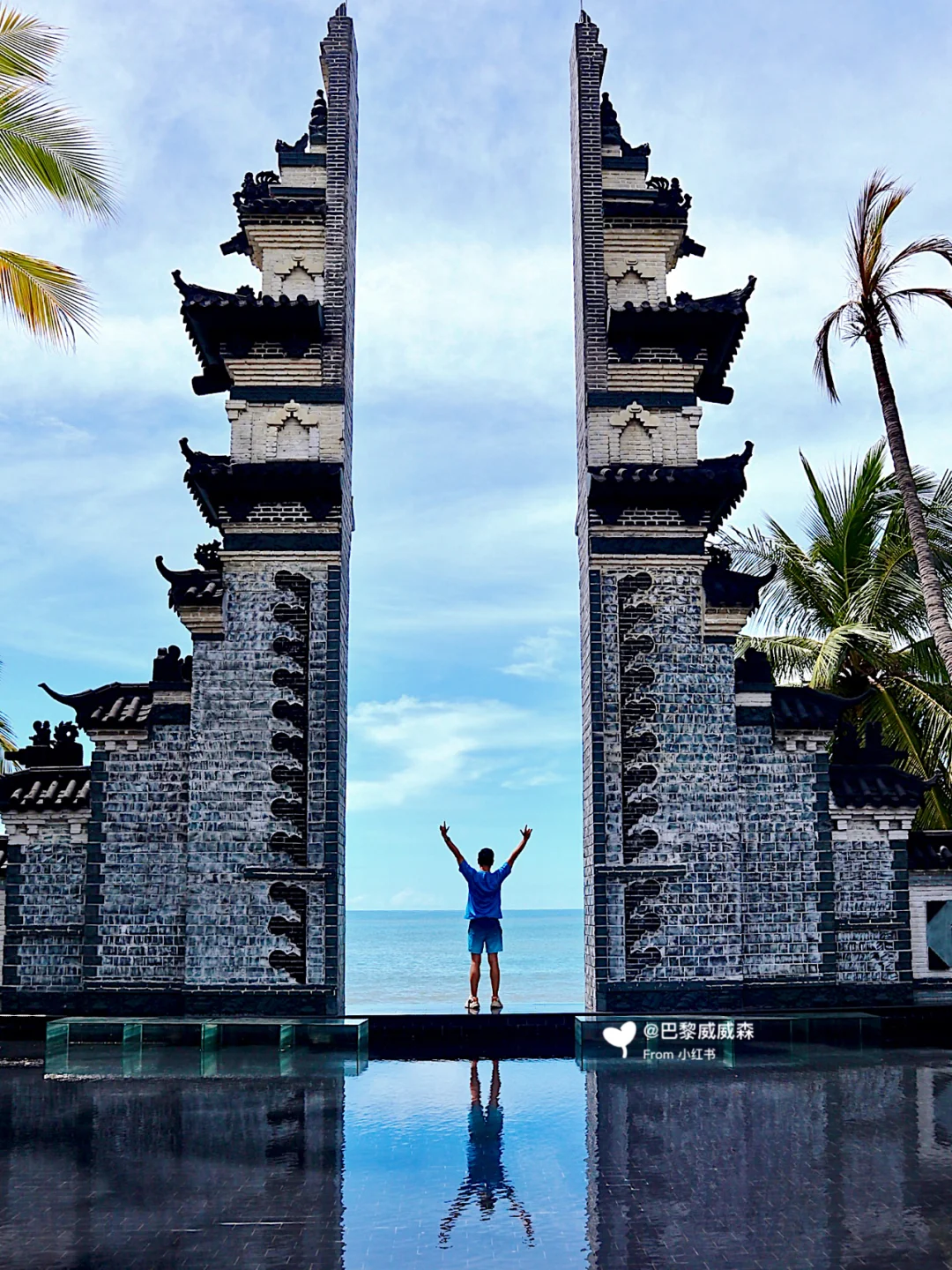 三亚呢,他有一个拍摄的婚纱基地是一个小众,打卡的地方,那其实他是个景区的入门区,但有很多适合拍照的一些设置,比如说他这里可以假装在巴厘岛,你找了一个的一线天的门,是不是很酷🆒.