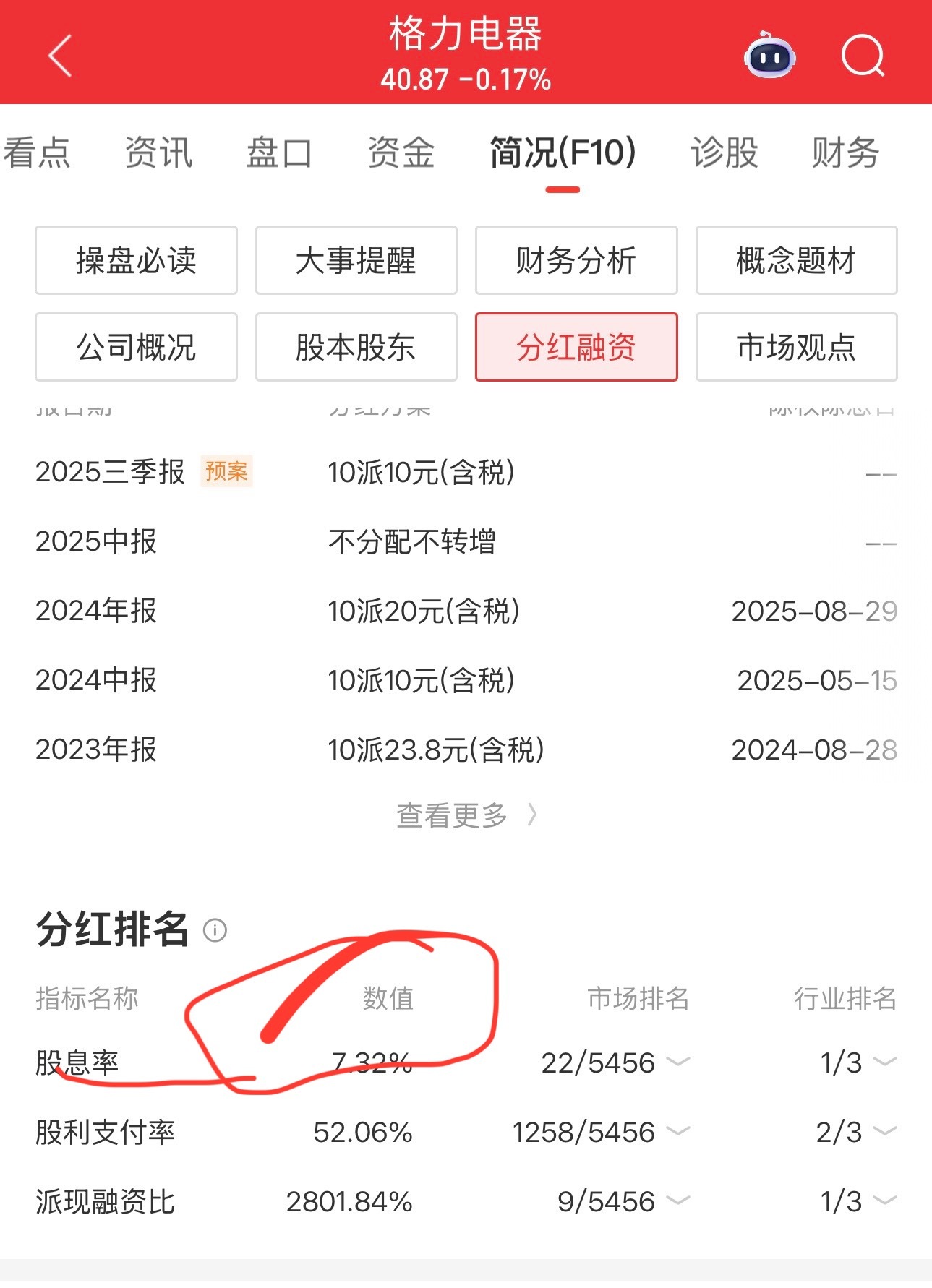 目前农业银行股息3.09%,四大行目前的股息不适合上涨了。格力电器7.32%,五